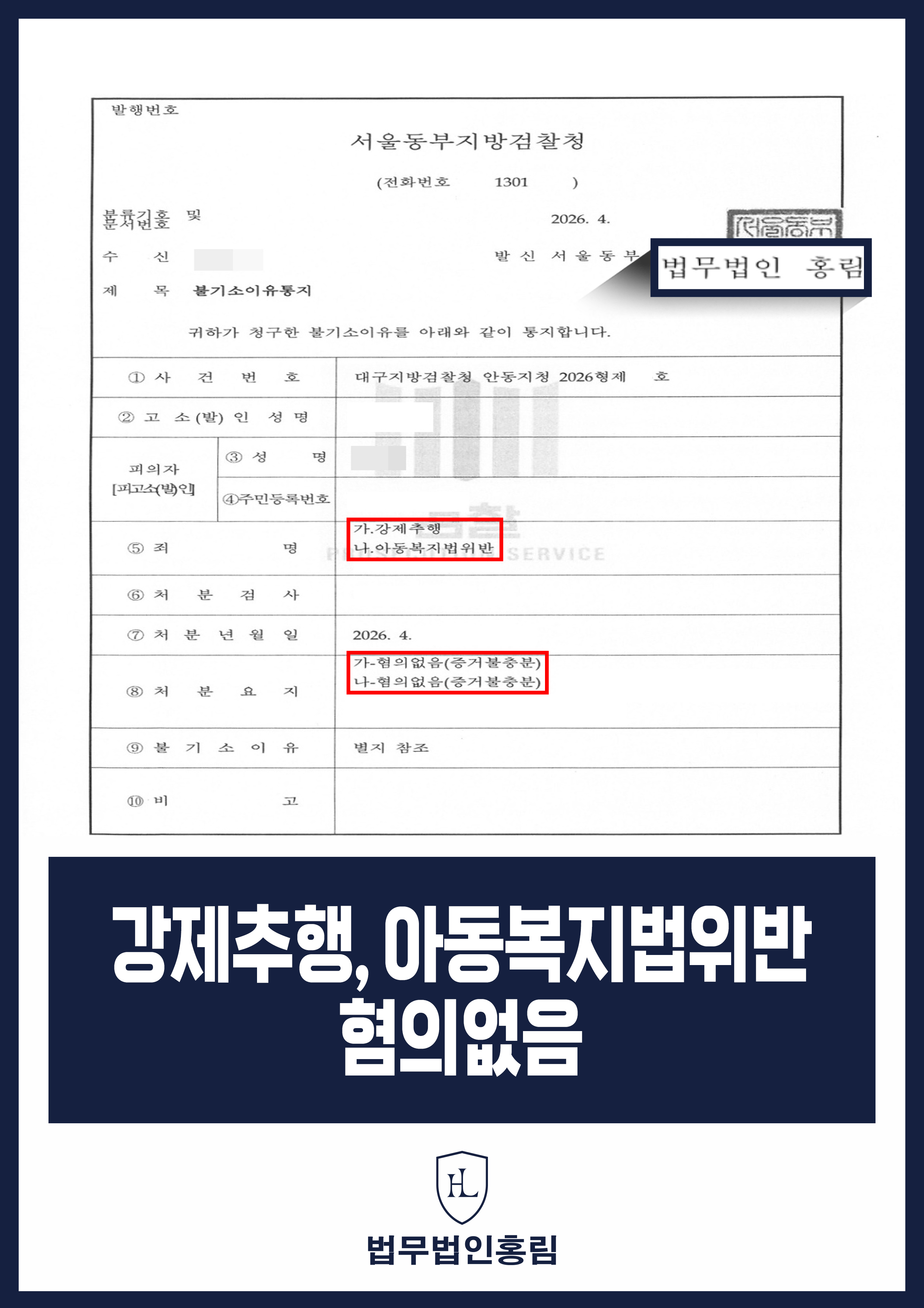법무법인 홍림의 증거 분석과 법리 구성 끝에, 수사기관은 의뢰인 E씨에게 제기된 강제추행 및 아동학대 혐의를 인정하기 어렵다고 판단하였습니다.