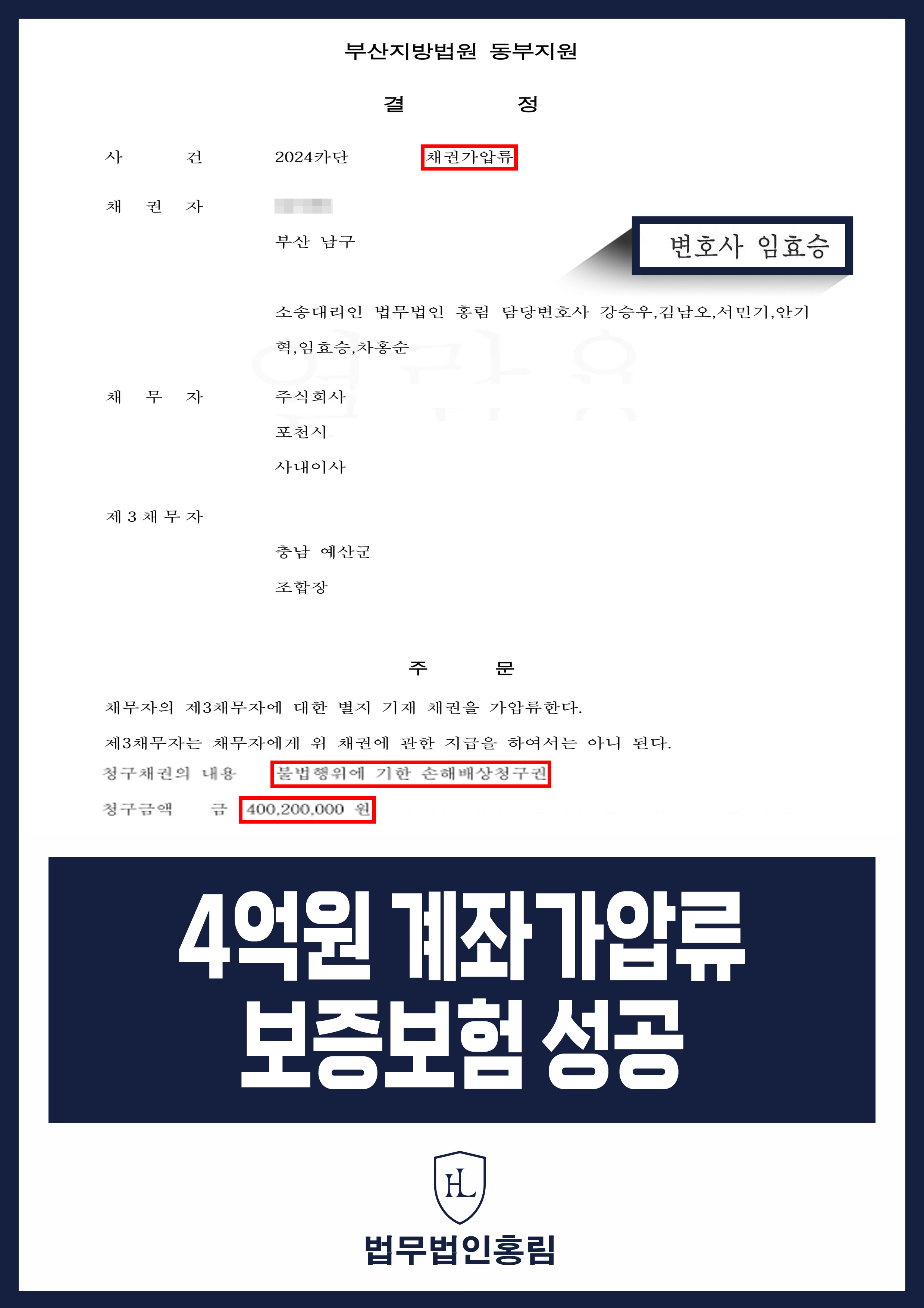 통장 가압류 성공사례 - 투자 사기 당한 4억원 계좌 전액 보증보험으로 이끌어내 투자금 보전한 사례 2025.05.26
