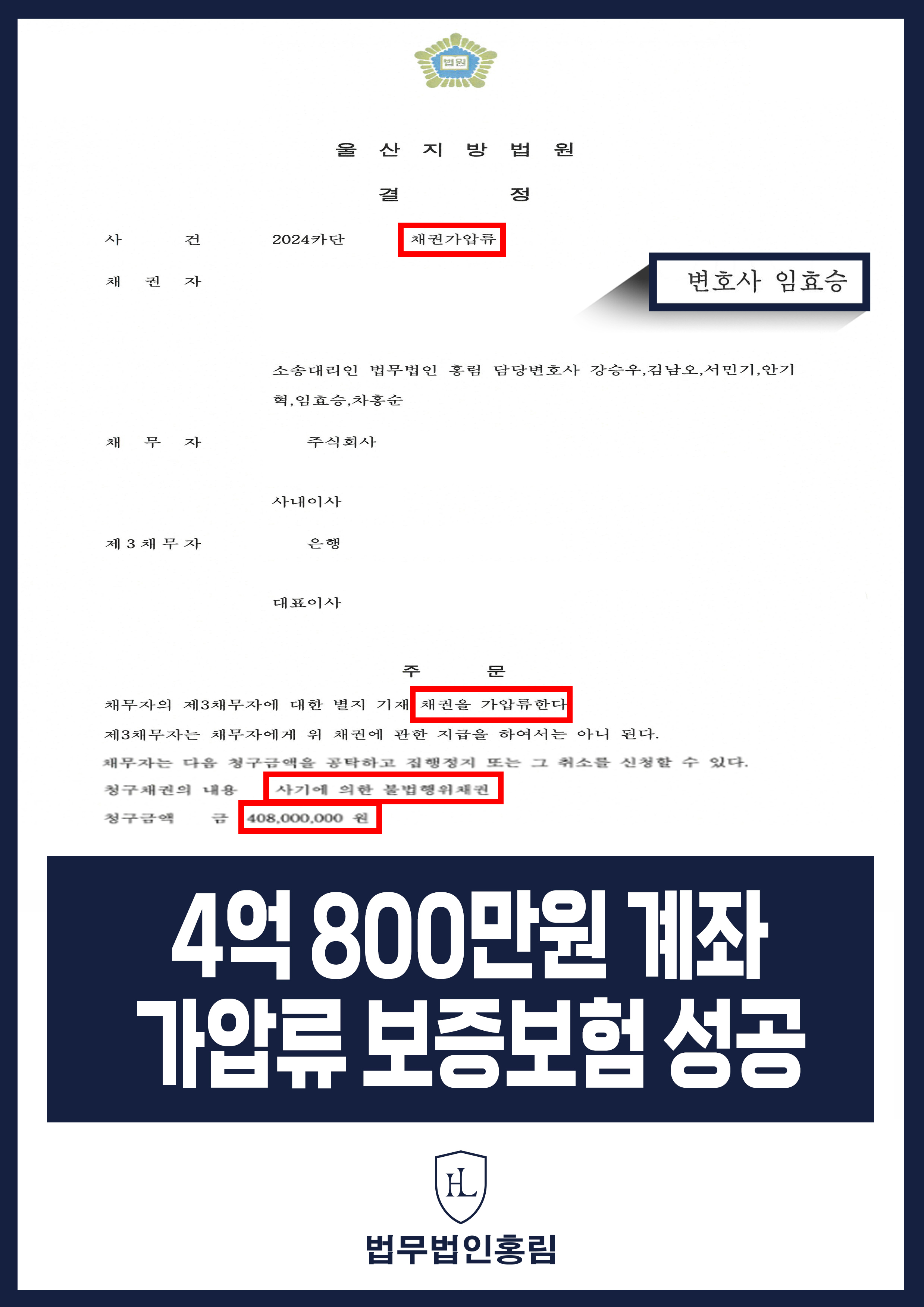 통장 가압류 성공사례 - 투자 사기 당한 4억 800만원 계좌 전액 보증보험으로 이끌어내 투자금 보전한 사례 2025.05.26