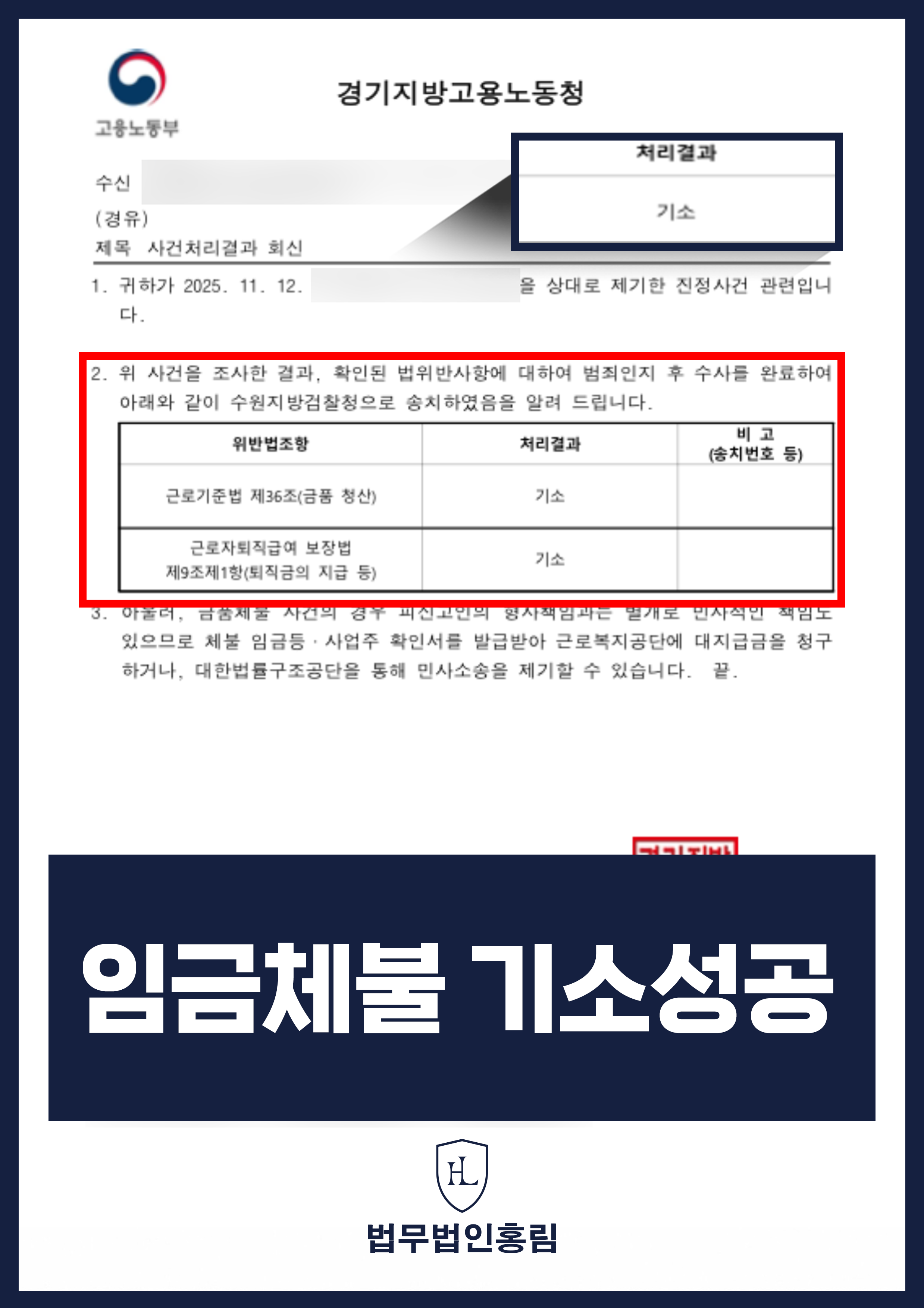 임금체불 기소성공 - 임금체불한 사업주를 상대로 노동청 진정을 통해서 조기에 형사기소에 성공한 사례 2026.02.12