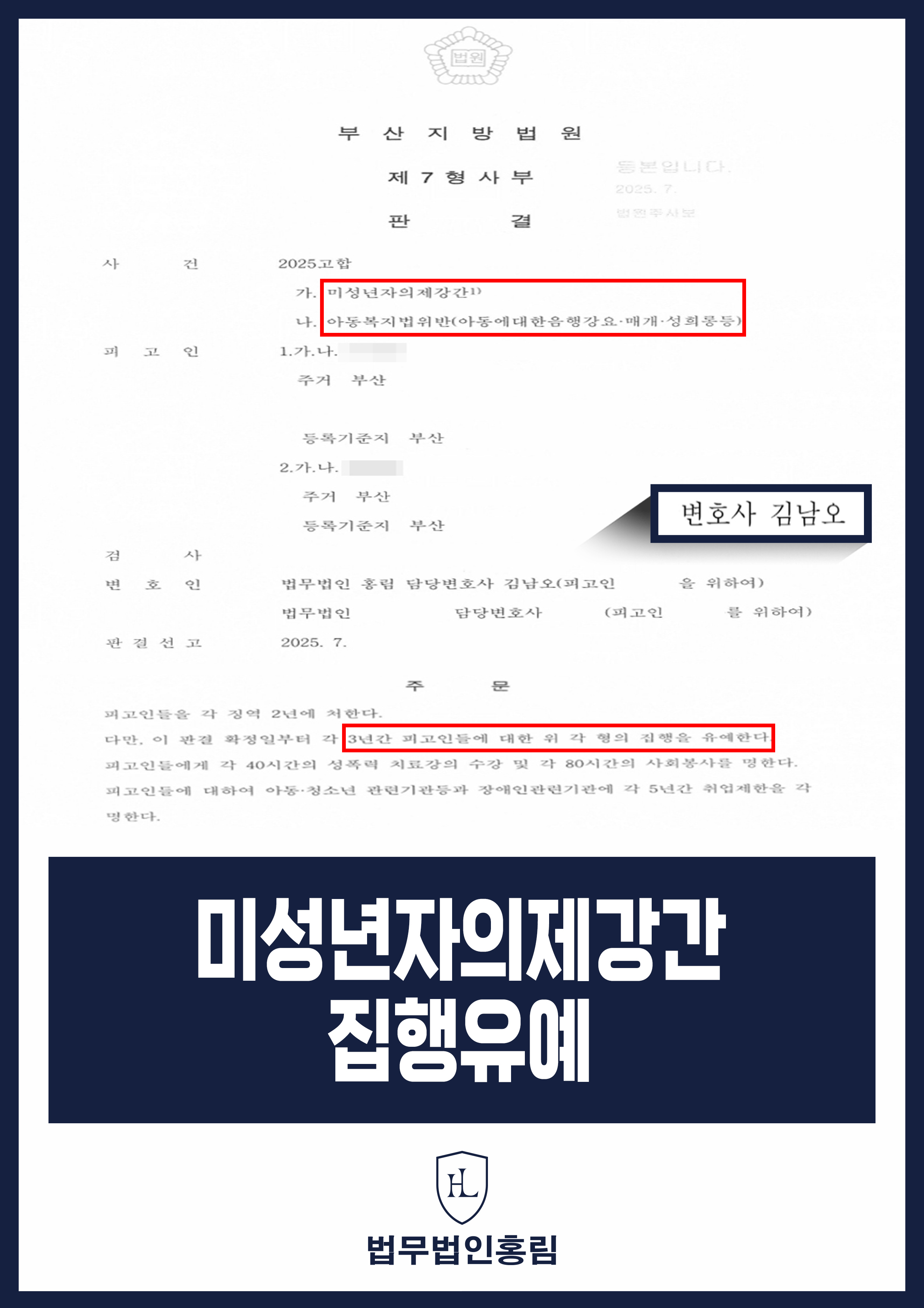 법무법인 홍림의 체계적인 조력과 의뢰인의 진심 어린 반성 덕분에, 재판부는 여러 양형 사유를 종합적으로 참작하여 의뢰인에게 미성년자의제강간 집행유예를 선고했습니다.