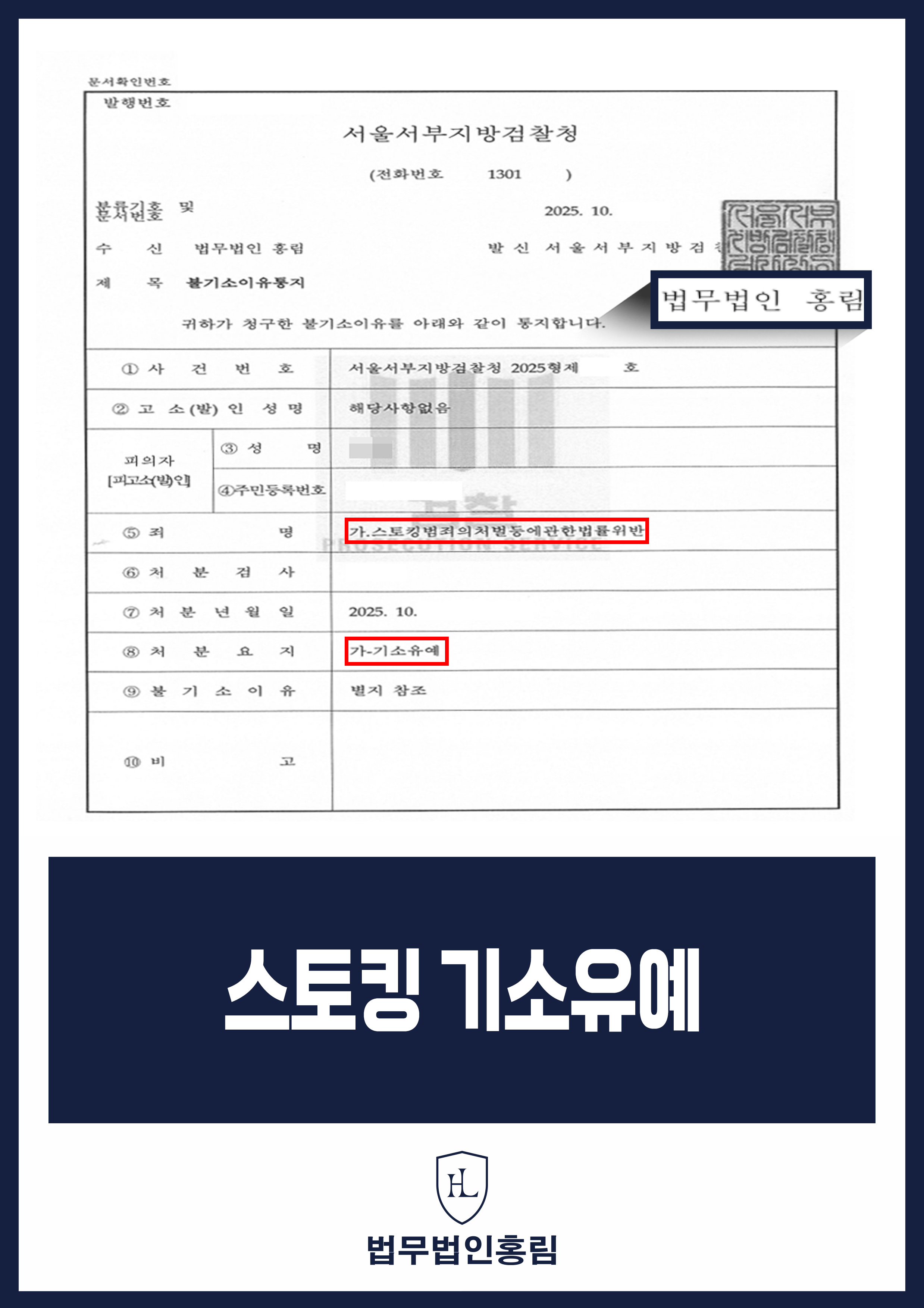 이는 스토킹 처벌법이 강화되어 엄격하게 적용되는 상황에서 형사 처벌 기록(전과)을 남기지 않고 사건을 성공적으로 마무리 지었으며, 의뢰인이 사회생활을 정상적으로 이어갈 수 있는 기회를 얻은 매우 성공적인 법률적 방어 사례로 평가됩니다. 법무법인 홍림은 의뢰인이 과거의 잘못을 청산하고 새로운 삶을 시작할 수 있는 소중한 발판을 마련해 주었습니다.