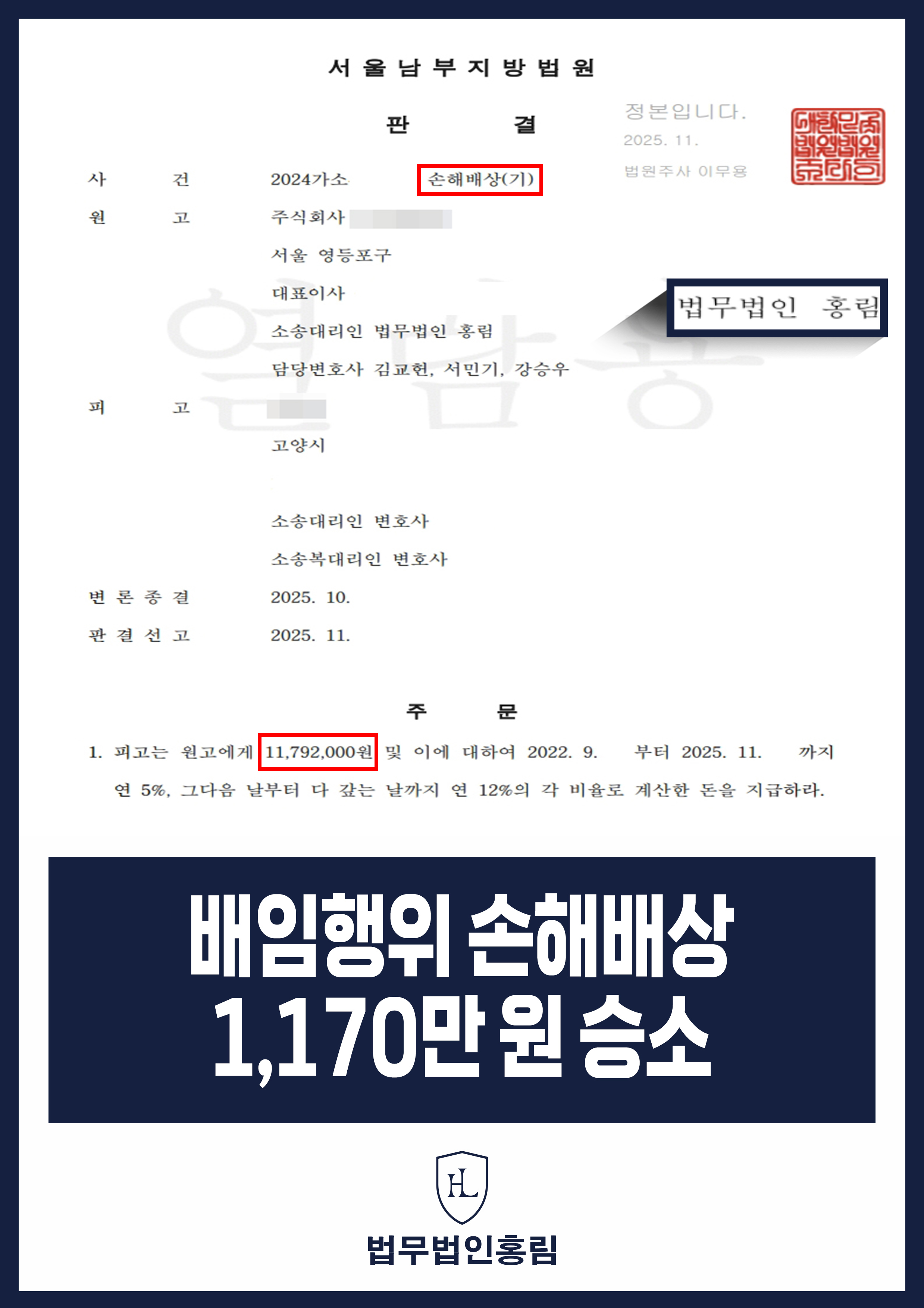 배임행위 손해배상 1,170만원 승소 - IT기업 임원 배임행위 손해배상 입증 성공 2025.11.14