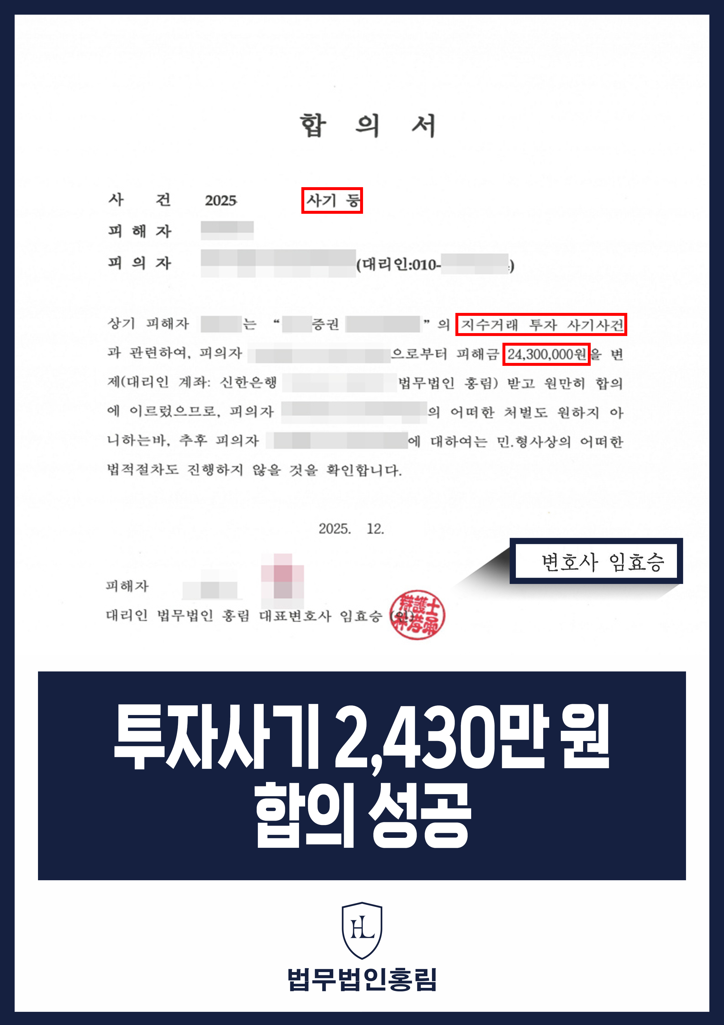 투자사기 2,430만 원 합의 성공 - 지수거래 투자 사기 조직원 고소해 피해 변제 성공 2025.12.02