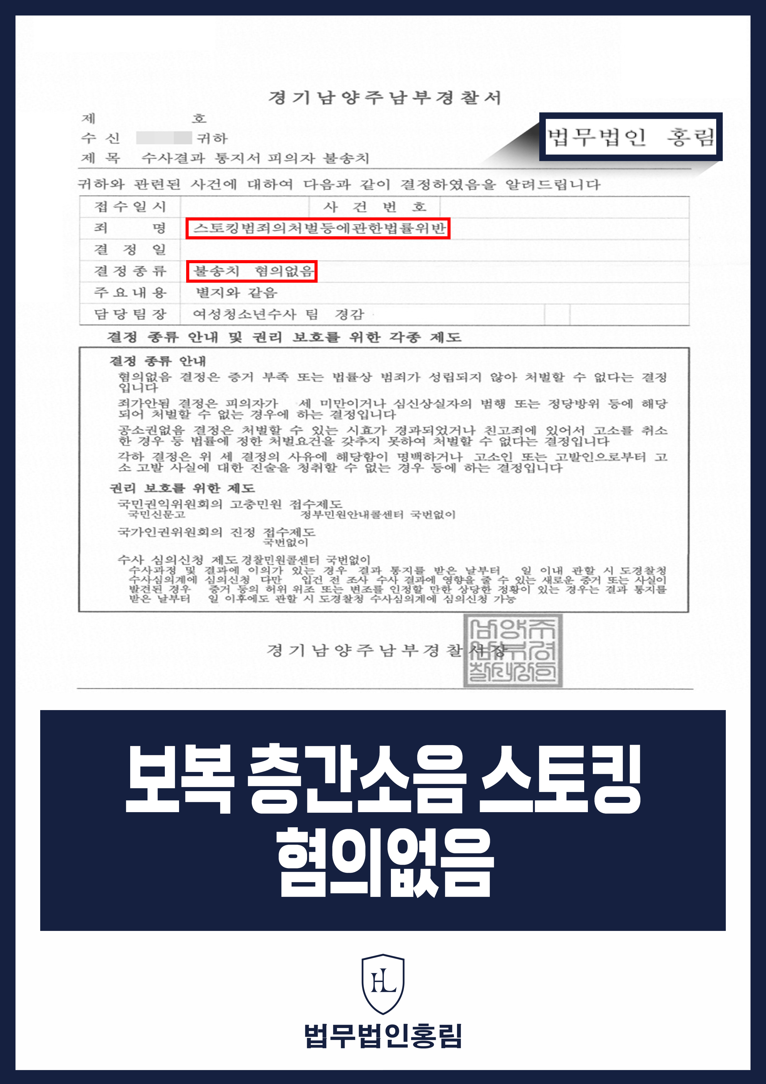이는 이웃 간의 민감한 층간소음 갈등이 스토킹범죄로 비화되어 억울하게 형사 입건될 위기 속에서, 전문 변호사의 조력을 통해 결백을 입증하고 무혐의로 사건을 종결지은 성공적인 방어 사례로 평가됩니다.