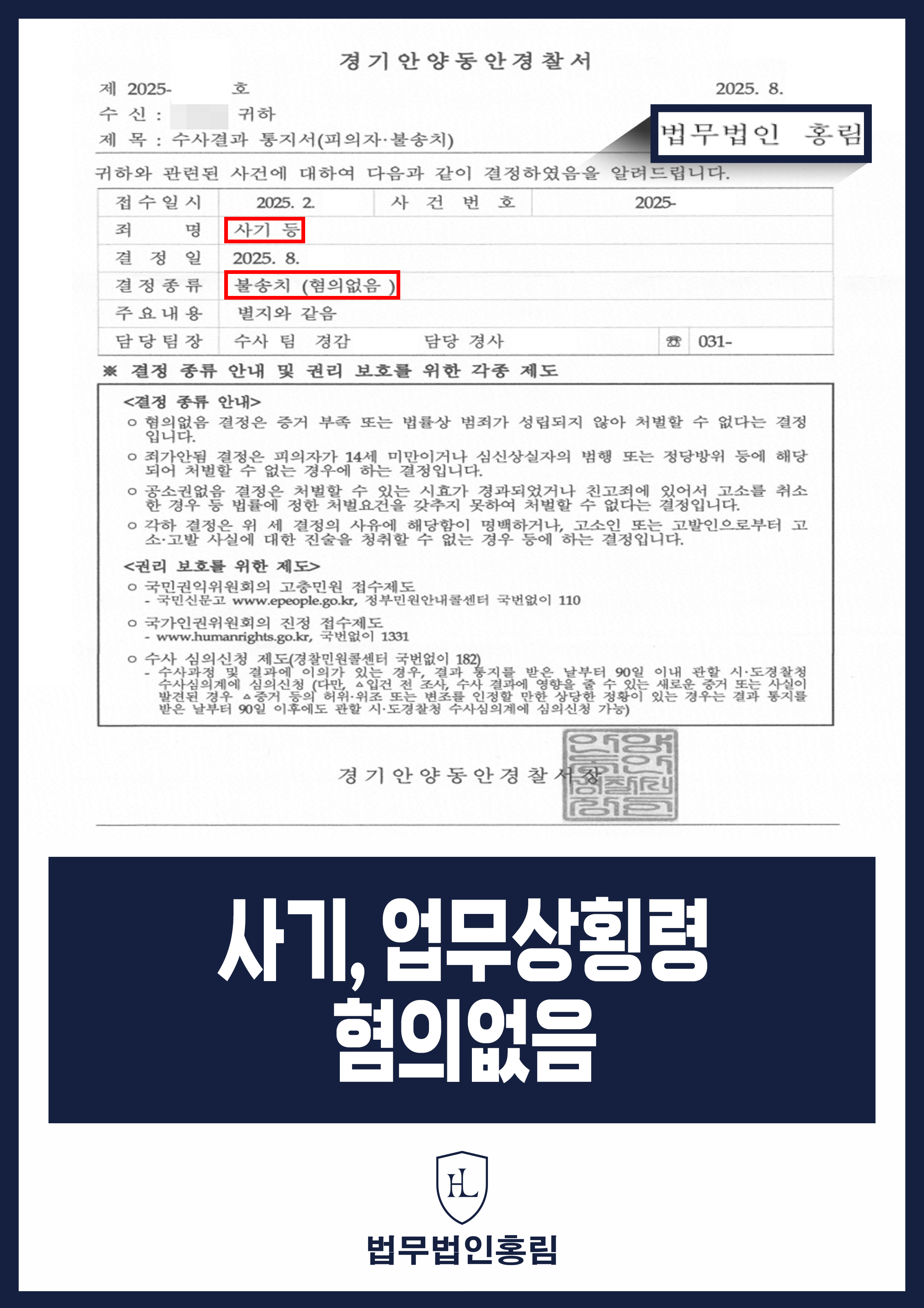 사기, 업무상횡령 혐의없음 - 동호회 공금 횡령 혐의 홍림의 조력으로 불송치 성공 2026.01.27