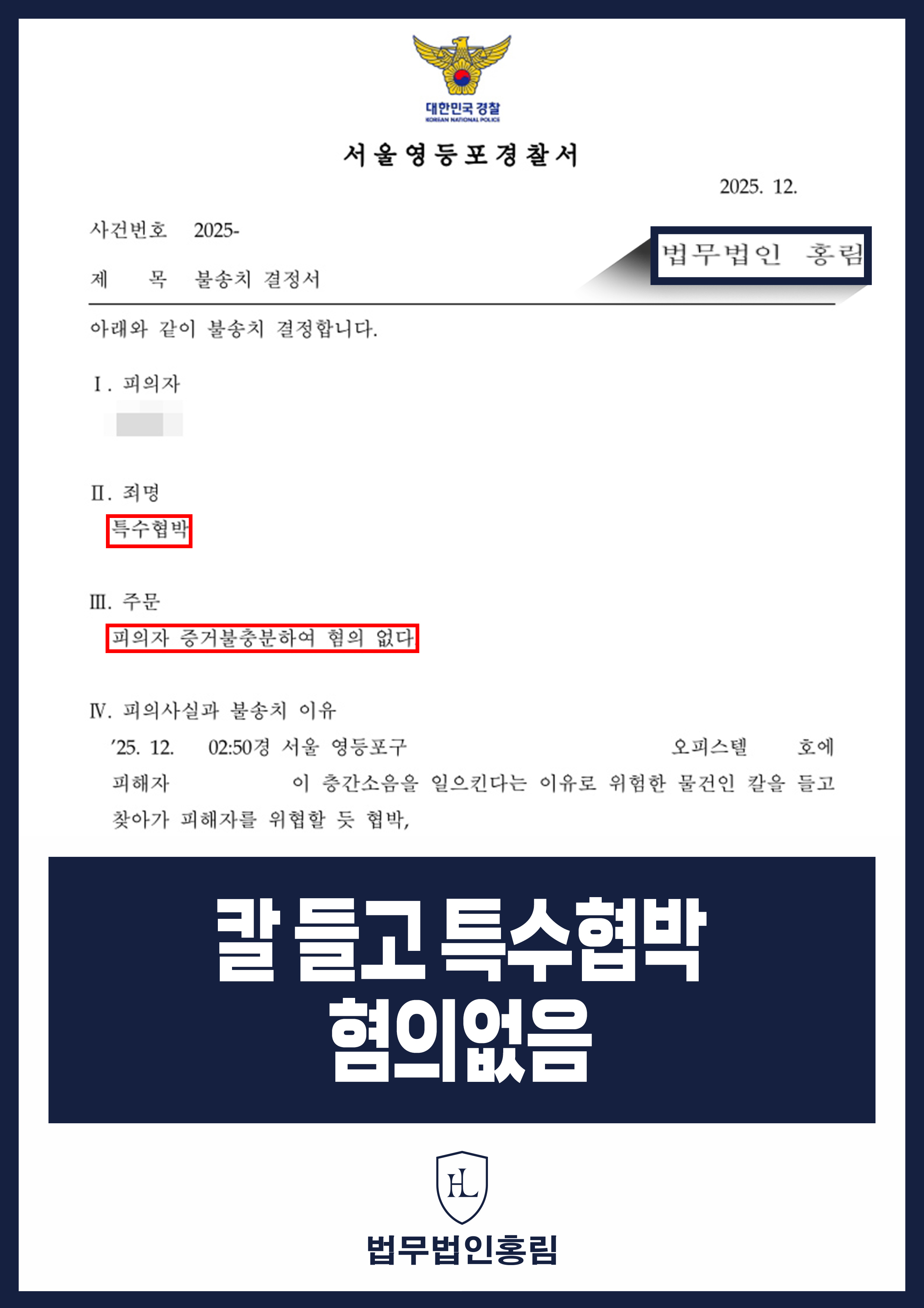 칼 들고 특수협박 혐의없음 - 층간소음 갈등 중 억울한 혐의 받았지만 불송치 성공 2026.01.29