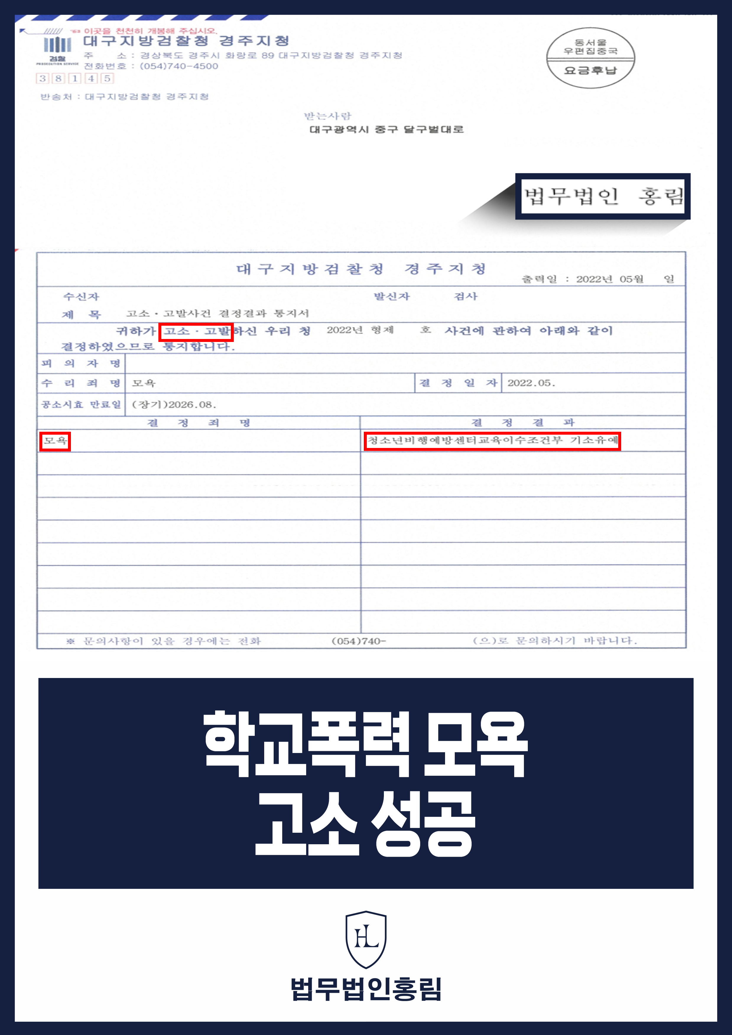 법무법인 홍림의 신속한 증거 수집과 논리적인 변론 결과, 경찰과 검찰은 홍림의 주장을 전격 수용했습니다. 검찰은 가해 학생들의 행위가 모욕죄에 정확히 해당하며, 오프라인상에서의 범죄 혐의가 명백히 인정된다고 판단했습니다. 다만, 피해자와 합의가 이뤄진 점, 가해자들이 아직 어린 미성년자이고 초범인 점 등을 감안하여 재판에 넘기지는 않는 '기소유예' 처분을 내렸습니다.