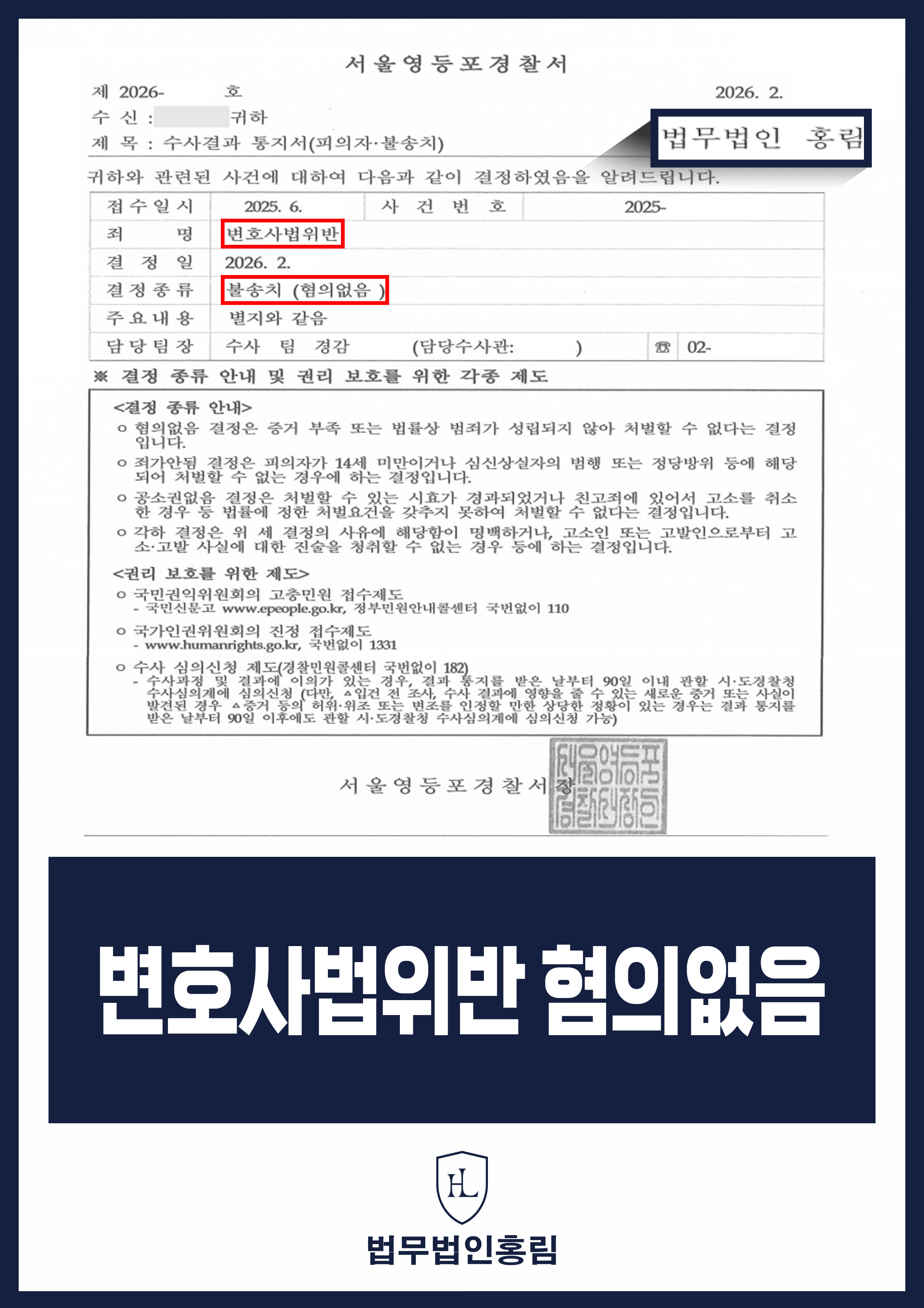 승소에 따른 성공보수 지급을 회피할 목적으로, 의뢰인은 "사무직원이 직접 사건을 수임하고 법률 업무를 처리했다"라고 주장하며 A씨를 변호사법 위반 혐의로 악의적으로 고소하였습니다. 승소의 기쁨도 잠시, A씨는 형사 처벌의 위기와 직장 내 입지가 흔들리는 절박한 상황에서 법무법인 홍림을 찾으셨습니다.