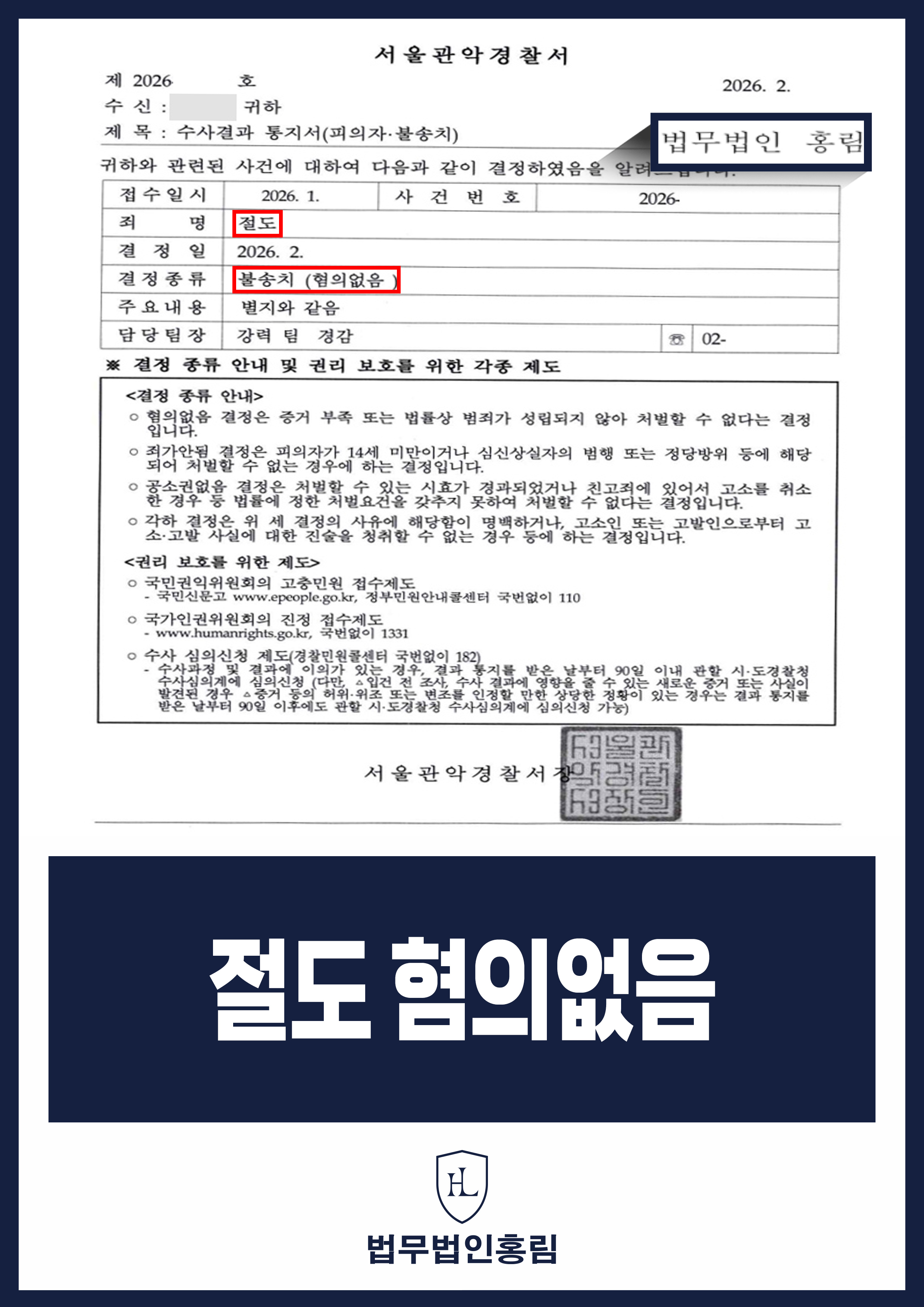 수사기관은 법무법인 홍림의 변론을 받아들여 의뢰인에 대해 절도 혐의에 대한 혐의없음(고의 없음) 결정을 내렸습니다.