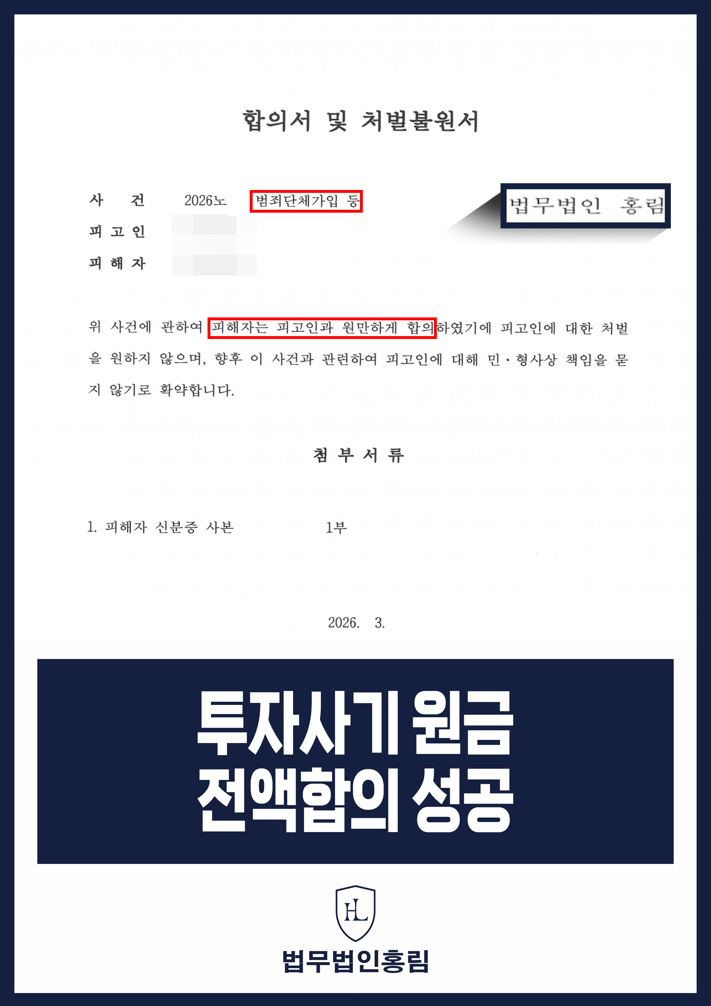 수사기관의 적극적인 수사와 법무법인 홍림의 전략적 협상이 맞물리며, 피의자는 결국 투자사기 원금 전액을 의뢰인에게 반환하는 내용의 합의에 서명하였습니다.