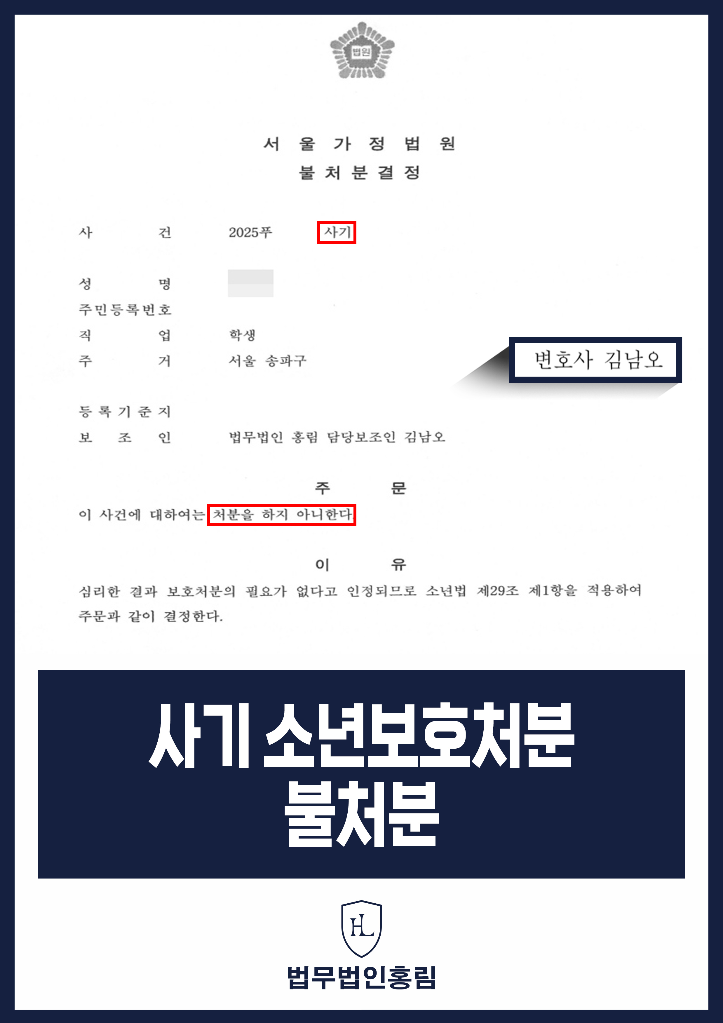홍림의 면밀한 사실관계 분석과 체계적인 자료 준비, 그리고 적극적인 심리 대응을 통해 A씨는 소년보호사건에서 최종 불처분 결정을 받았습니다.