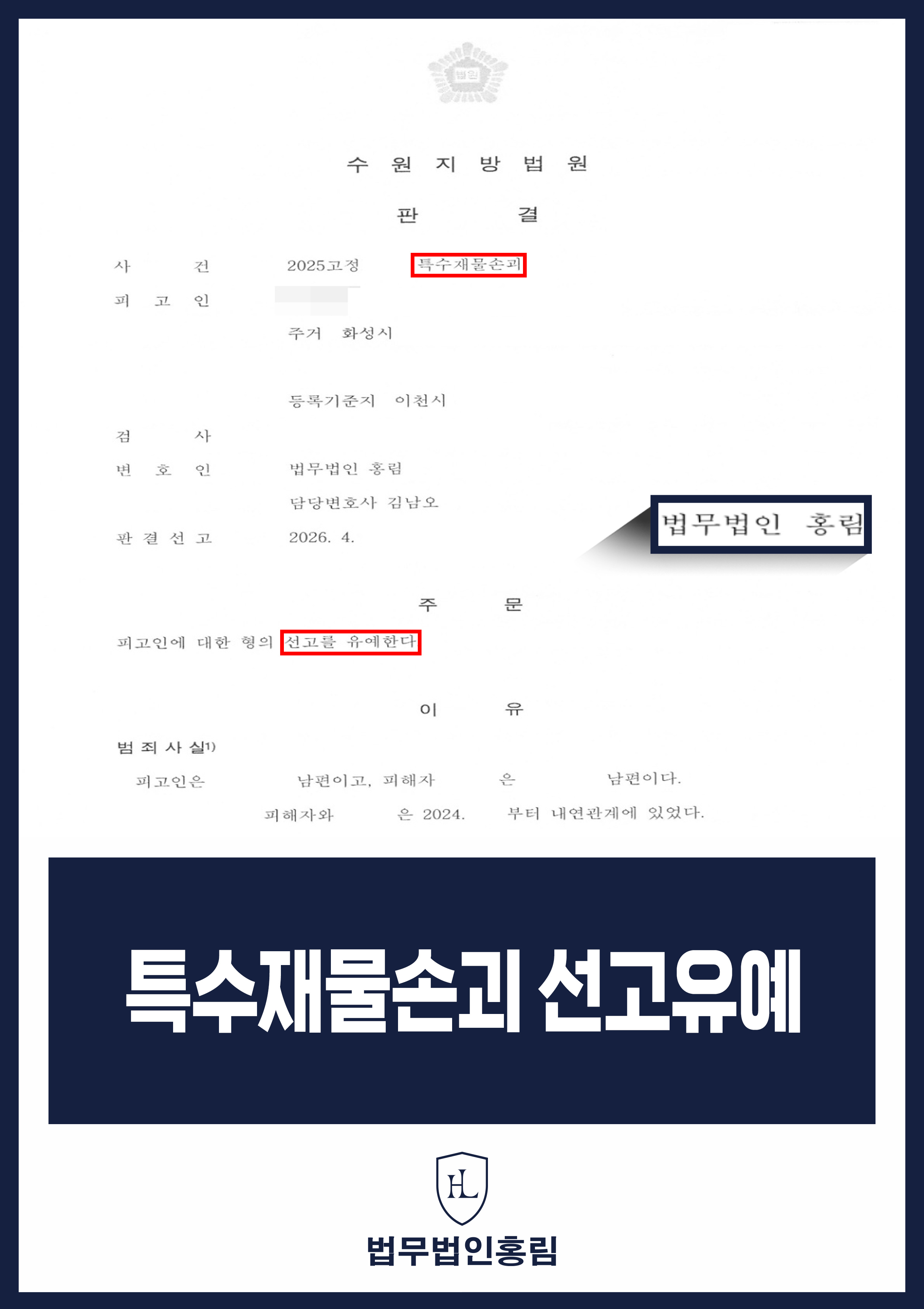 특수재물손괴 선고유예 - 배우자 외도 목격 후 차량 손괴, 변호인 조력으로 선처 성공 2026.04.16