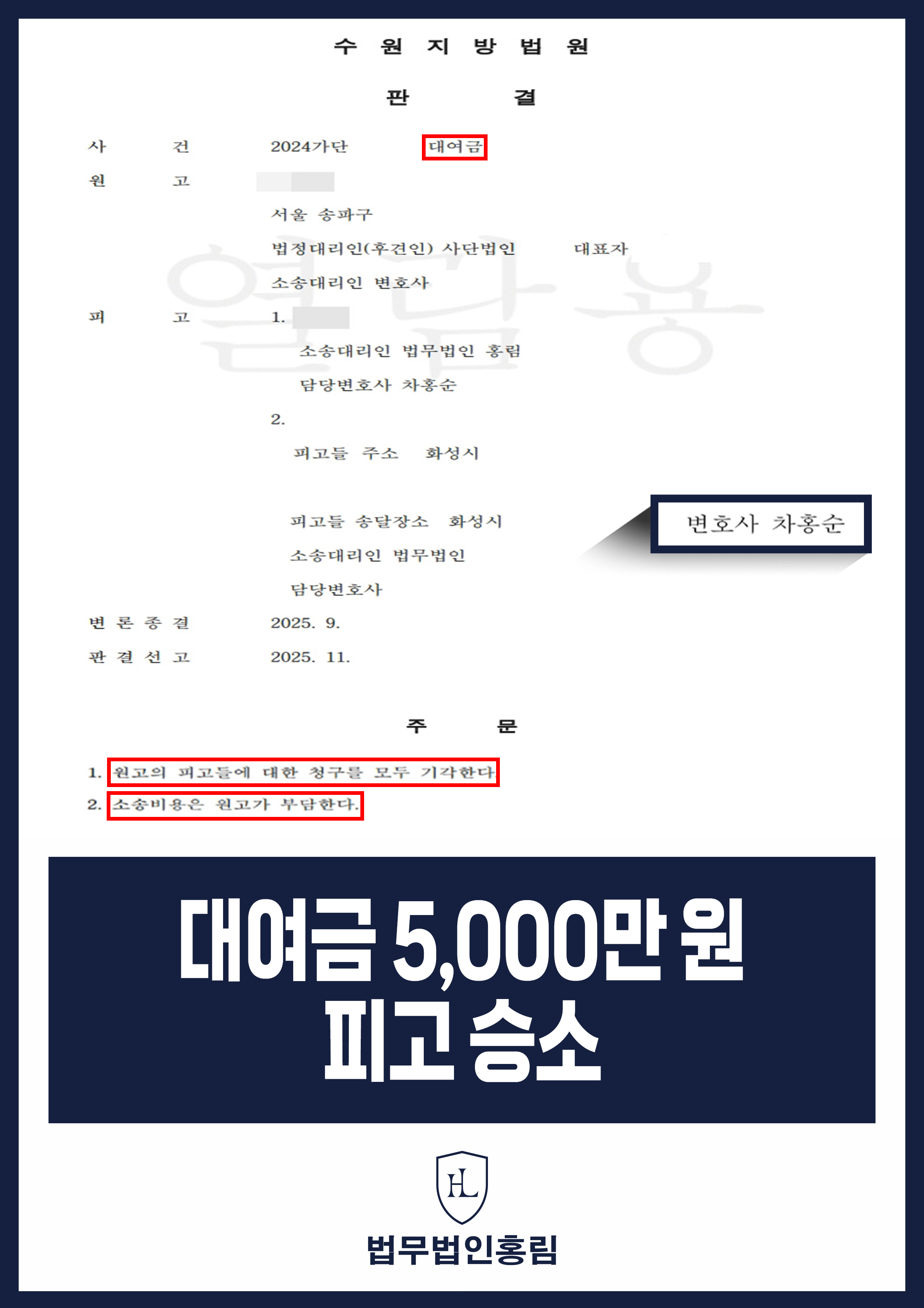 법무법인 홍림은 원고 측이 제출한 주장과 증거의 모순점을 정확히 짚어 반박하였고, 원고가 제출한 자료만으로는 의뢰인이 차용인이라는 사실을 입증하기에 부족하다는 점을 명확히 변론하였습니다.