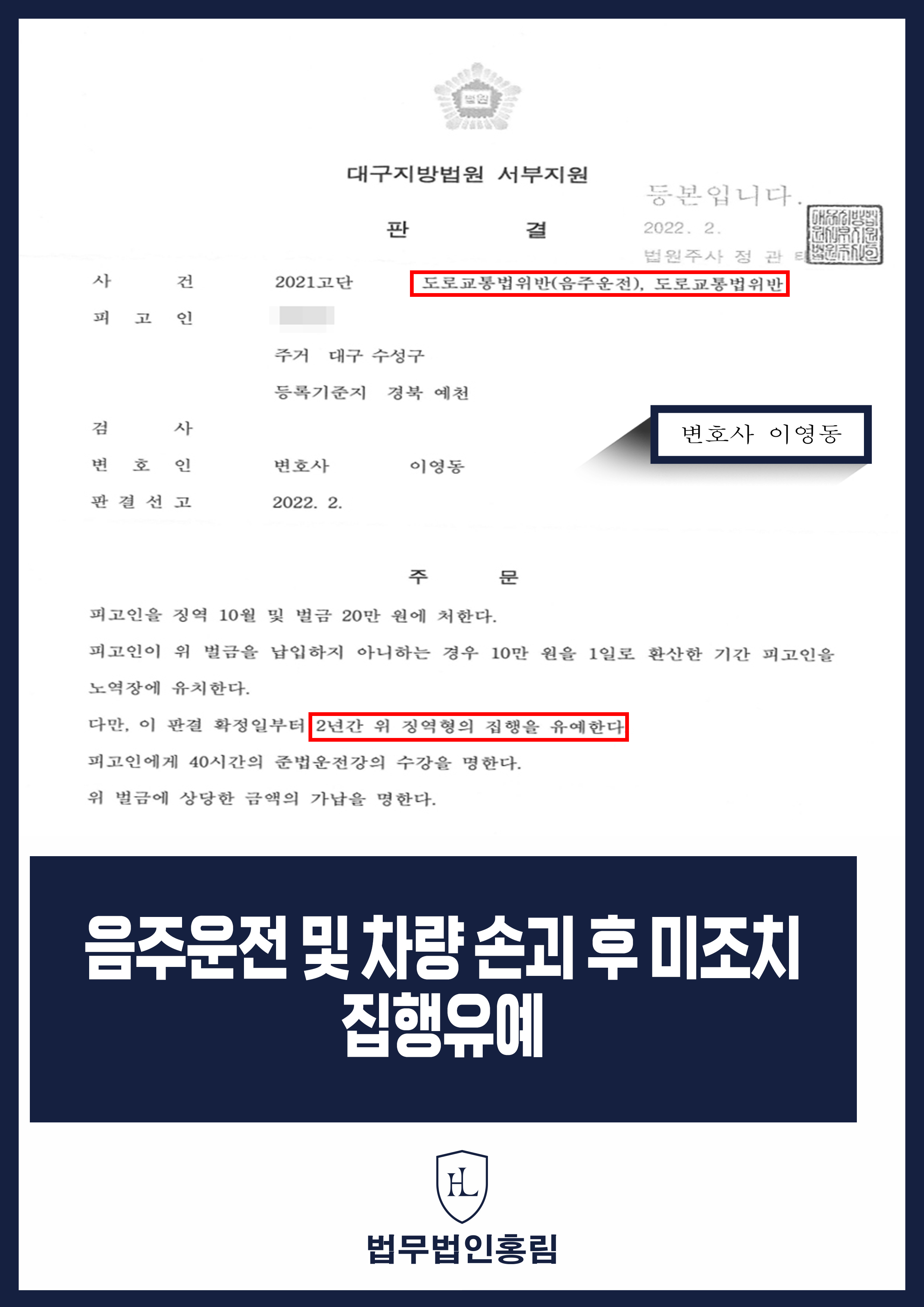 결과적으로 재판부는 의뢰인에게 실형을 선고하는 대신 집행유예를 선고하는 관대한 선처를 베풀어 주었습니다.
