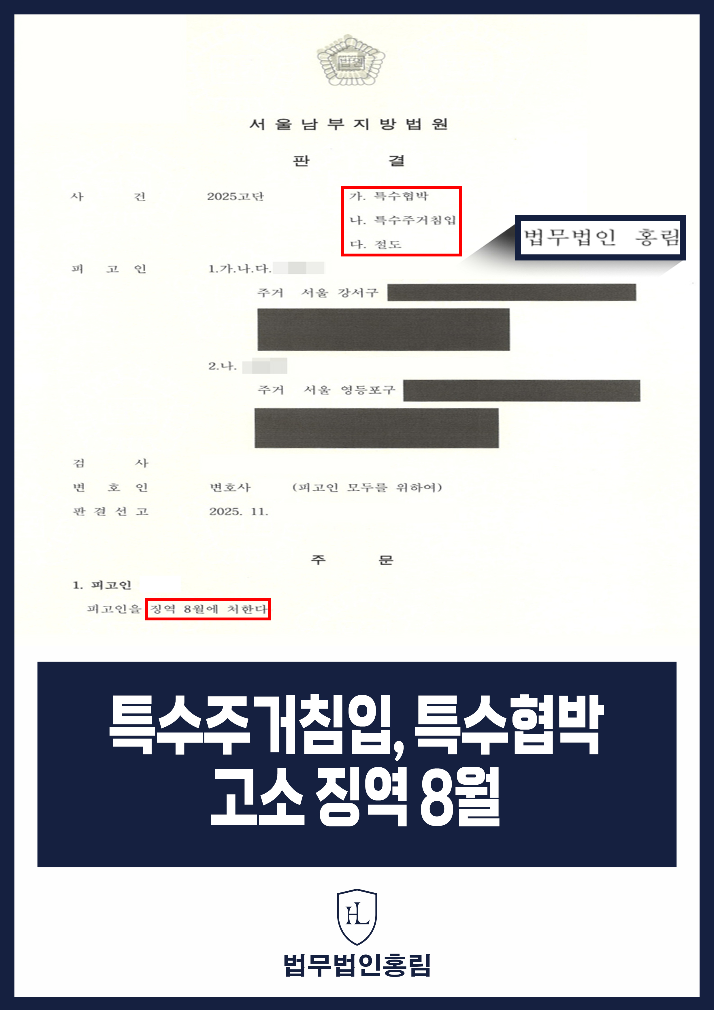 특수주거침입, 특수협박 고소 징역 8월 - 내부 고발 의심받고 피해입은 의뢰인, 고소해 직장 동료 징역형 성공 2025.11.17
