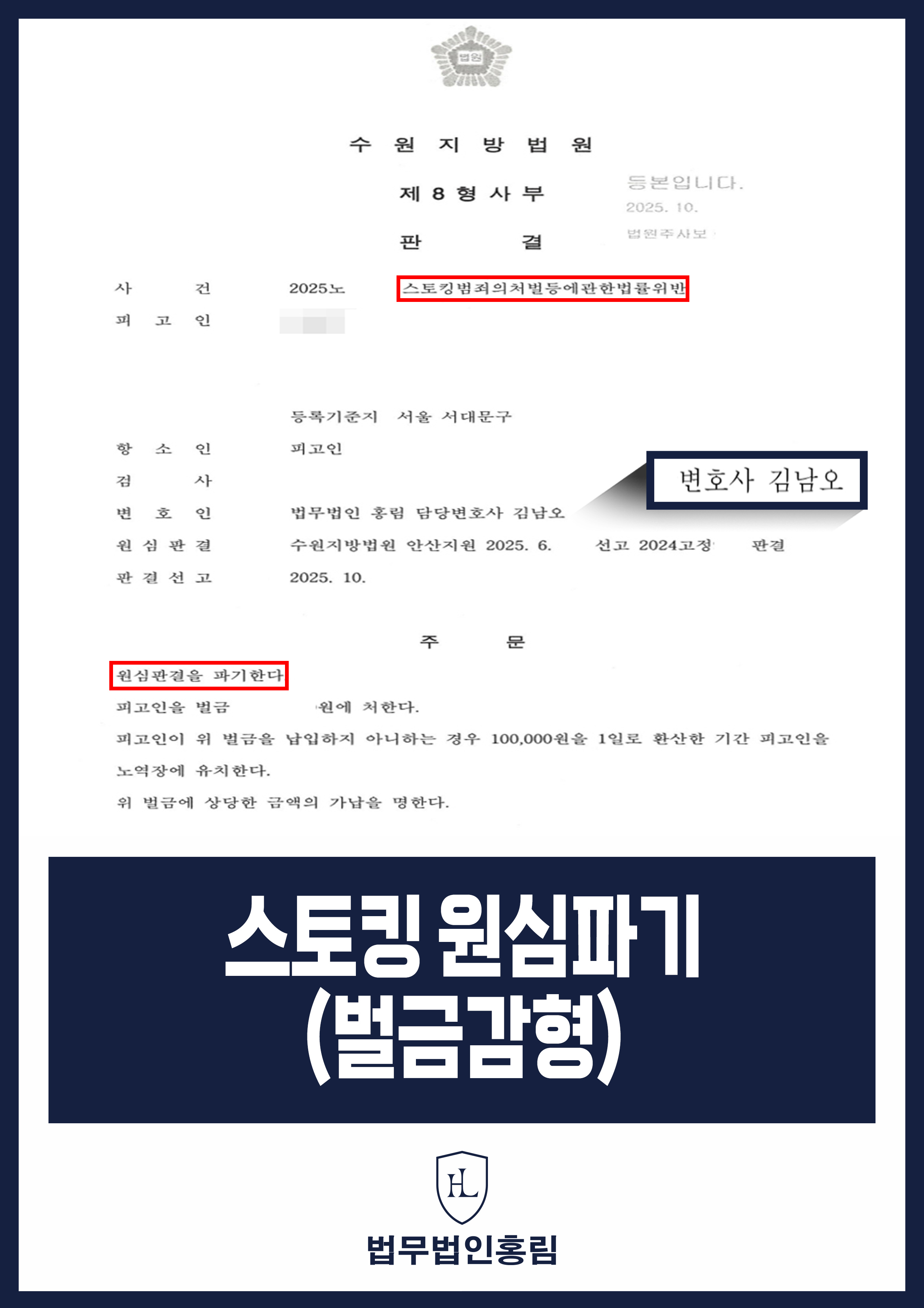 스토킹 원심파기(벌금감형) - 취재 활동하다 스토킹 고소당한 언론인 조력해 원심파기 및 벌금 감형 성공 2025.11.24