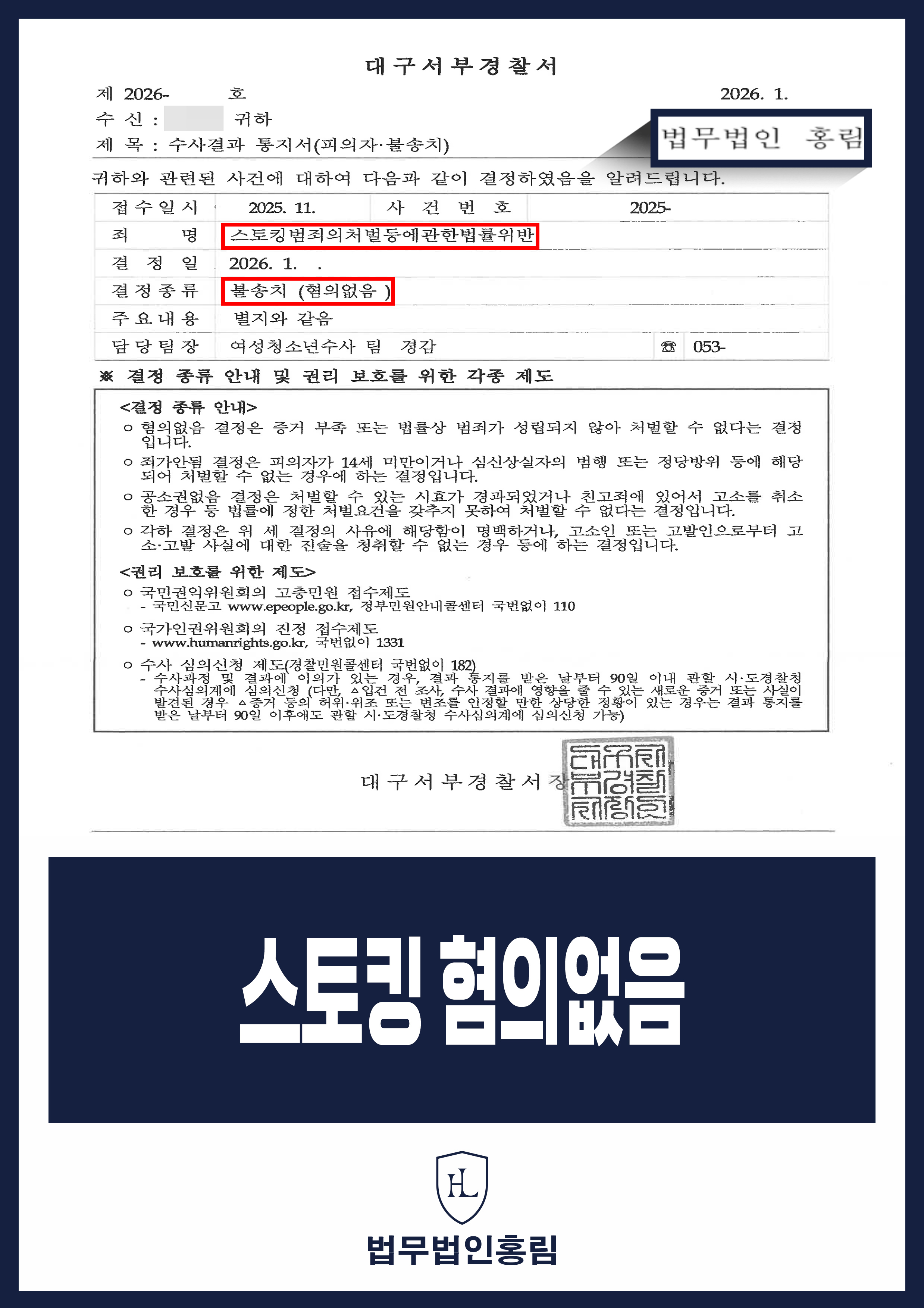 - 수사 기관은 법무법인 홍림이 제출한 치밀한 논거와 증거 자료들을 받아들여 B씨의 행위가 스토킹성립요건 불성립 사유에 해당한다고 최종 판단하였습니다.