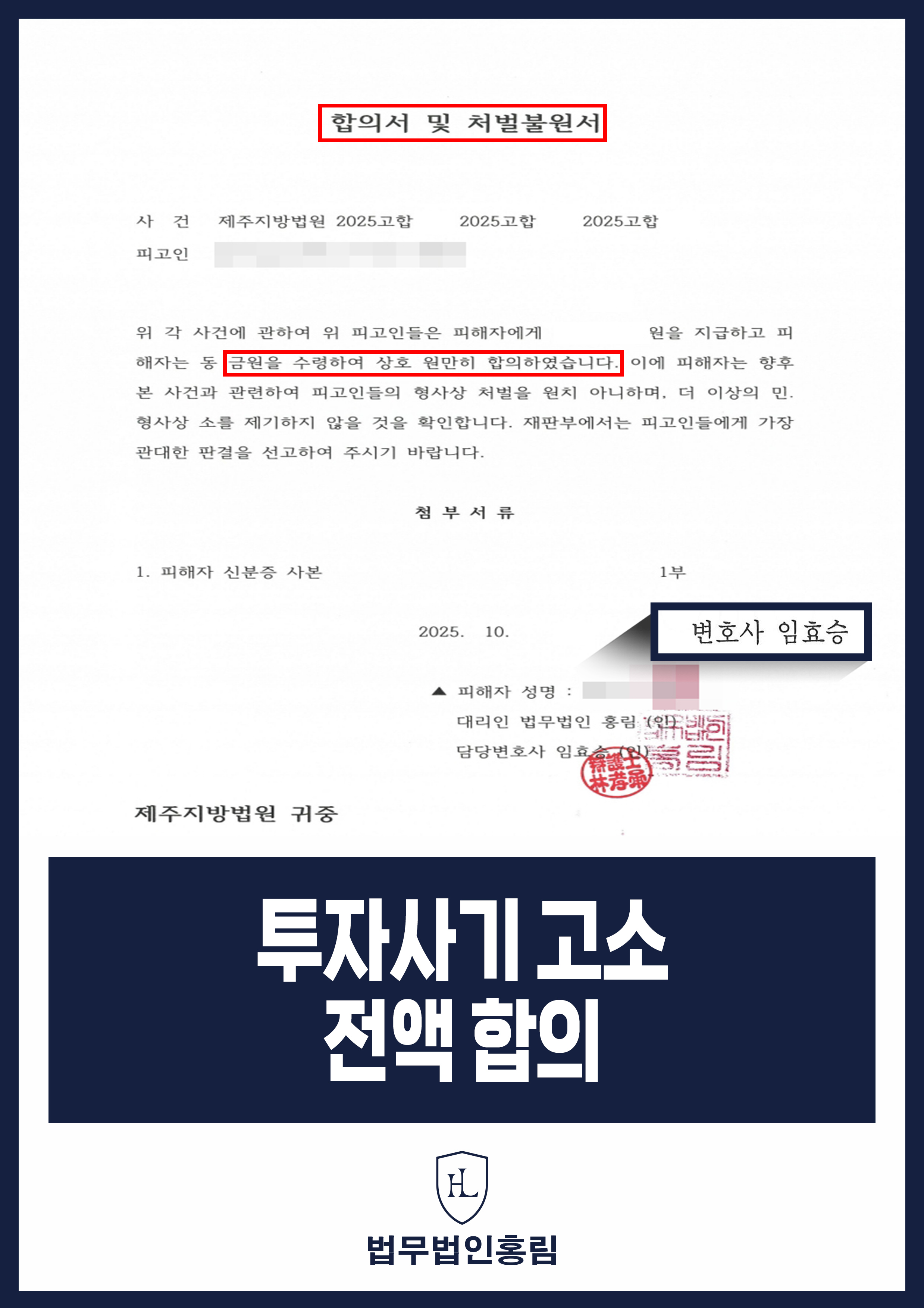 궁지에 몰린 피고소인들은 합의를 요청했고, 법무법인 홍림 변호인의 능숙하고 강력한 협상 조력에 힘입어 의뢰인 A씨는 투자 원금 전액을 반환받는 조건으로 합의에 이르렀습니다.
