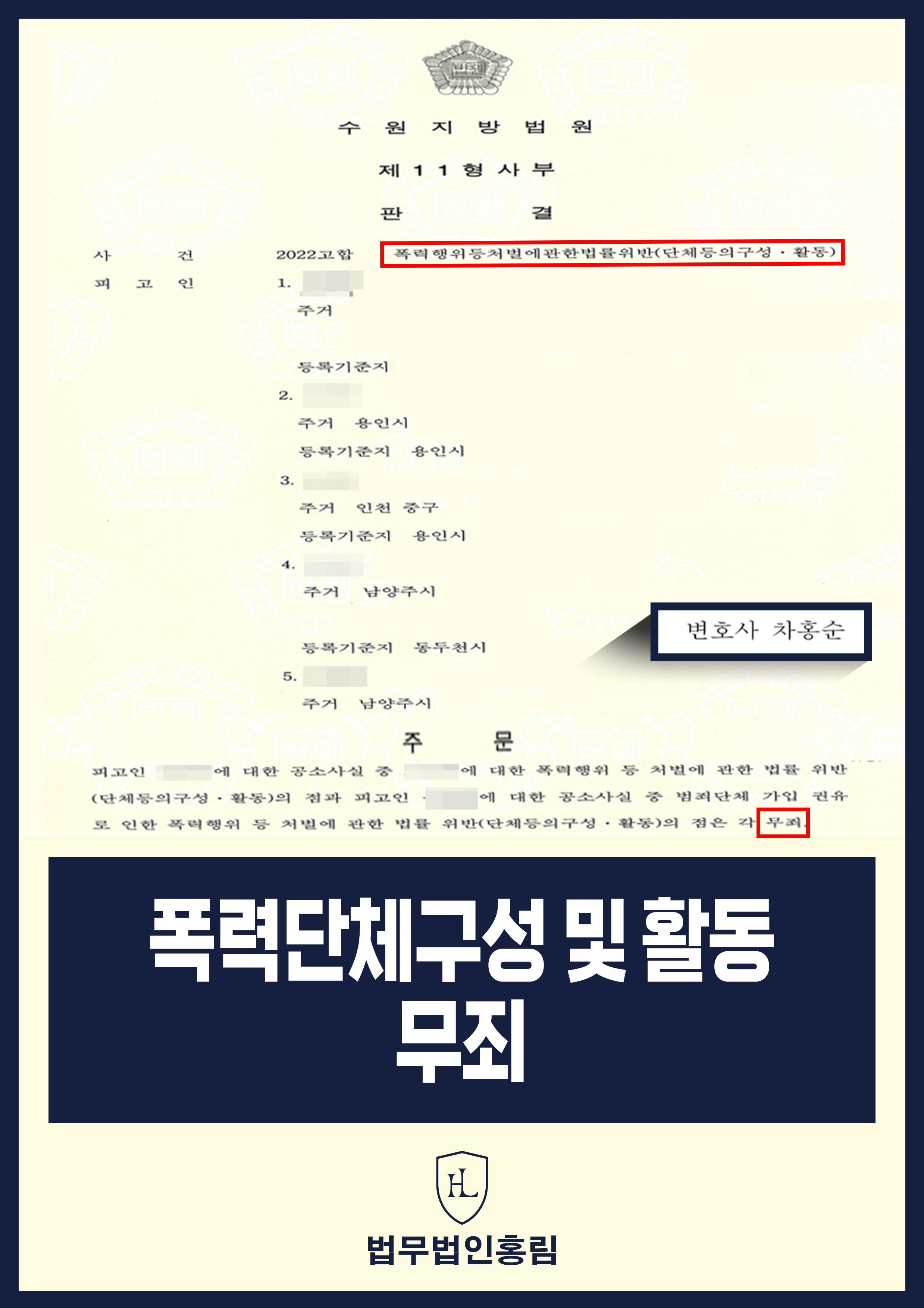그 결과, 재판부는 피고인들에게 적용된 폭력단체 구성 및 활동 혐의 전부에 대해 무죄를 선고하였습니다. 실형이 불가피했던 중대한 폭력 조직 관련 혐의에서 벗어난 의뢰인들은 법무법인 홍림의 조력을 통해 억울함을 해소하고 자유를 회복하며 성공적인 재기를 위한 기회를 얻을 수 있었습니다.