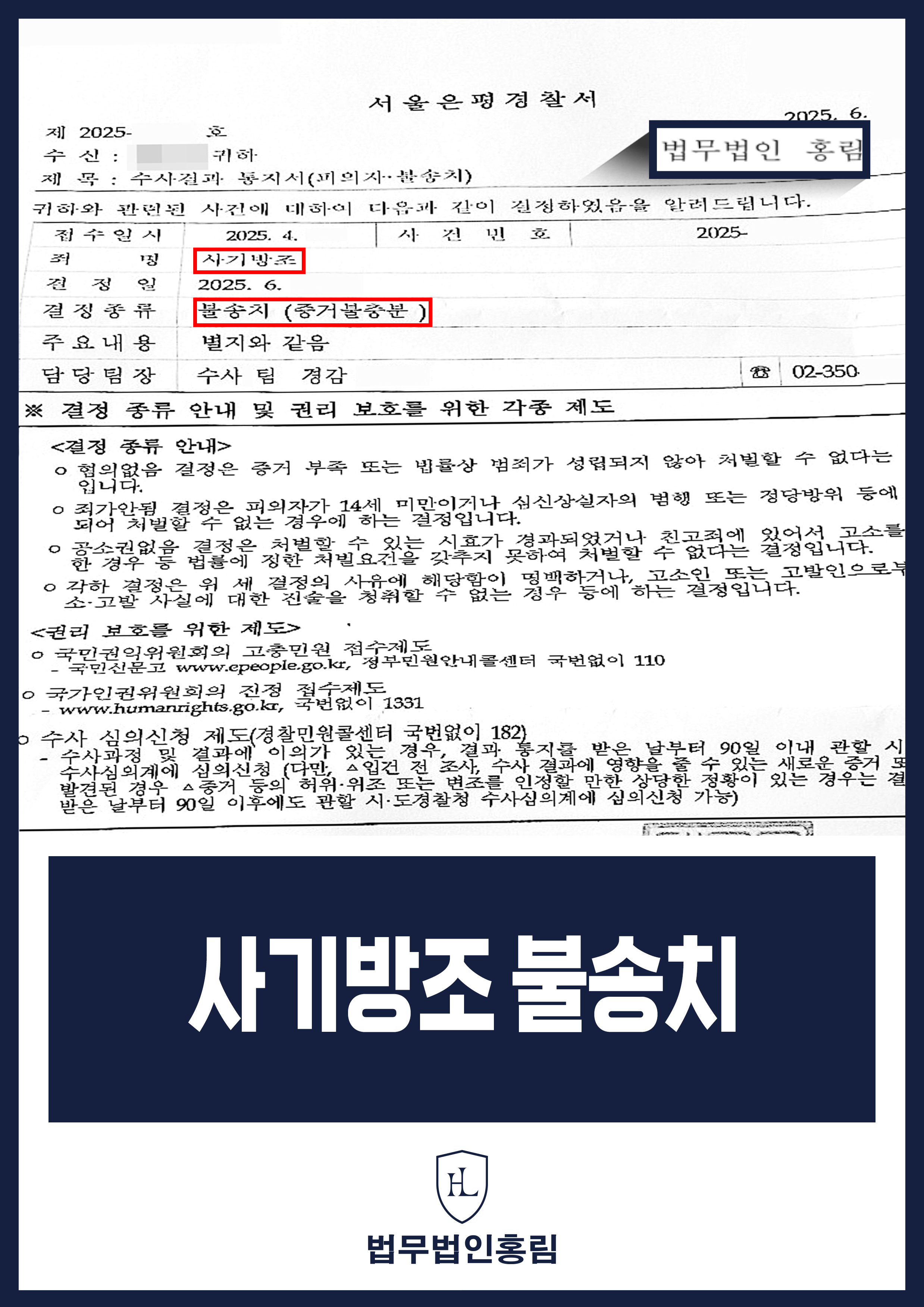 그 결과, 경찰은 의뢰인에게 적용된 사기방조 혐의에 대해 불송치(혐의 없음) 결정을 내렸습니다.