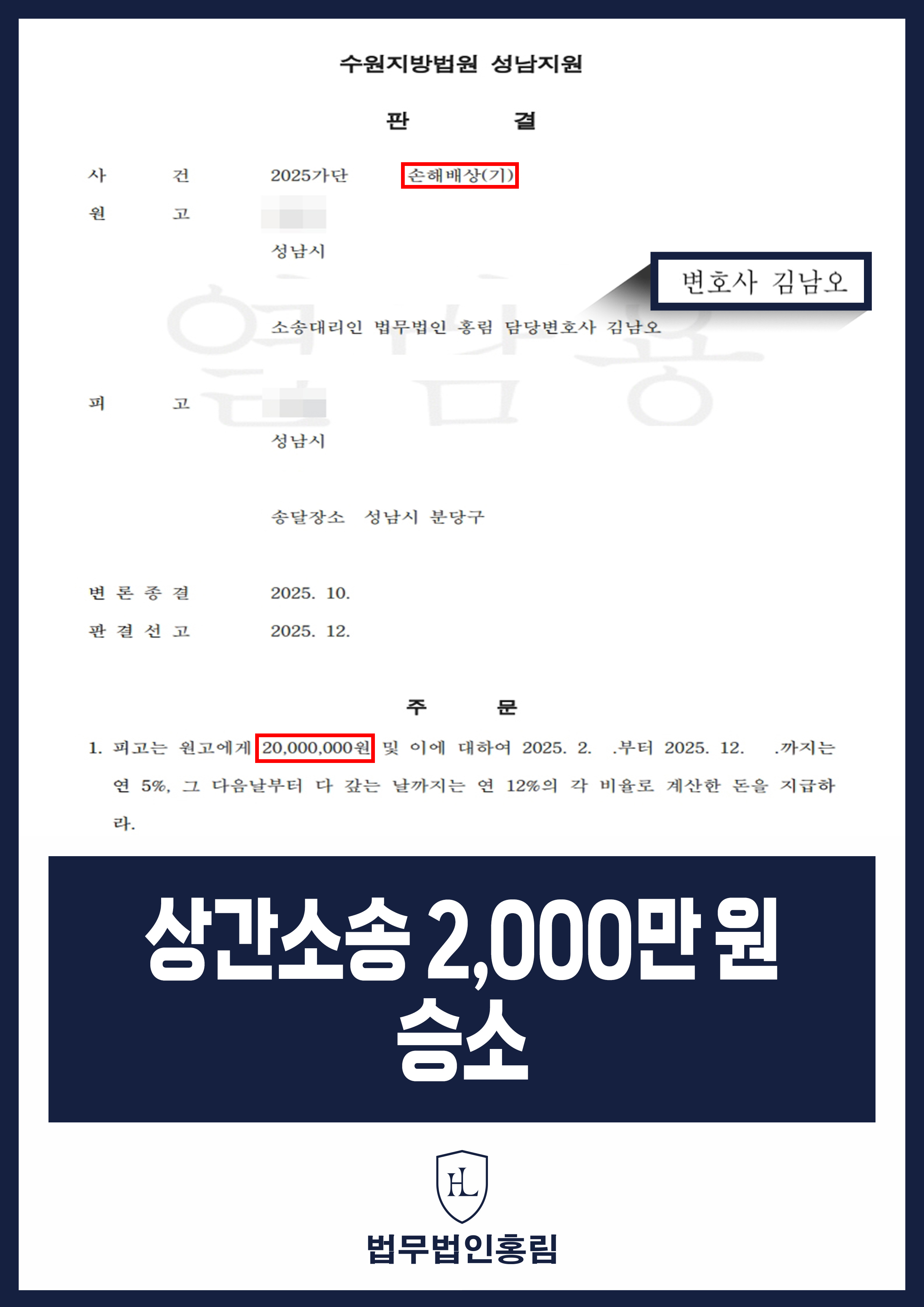 이 판결은 통상적인 상간 소송 위자료 기준인 1,000만 원~1,500만 원선을 상회하는 결과로서, 법무법인 홍림이 부정행위의 악의성과 의뢰인의 고통을 효과적으로 소명하여 이끌어낸 유의미한 성과입니다. 의뢰인은 비록 무너진 마음을 다 회복할 수는 없었으나, 법적인 단죄를 통해 정당한 권리를 구제받고 새로운 시작을 위한 발판을 마련할 수 있었습니다.