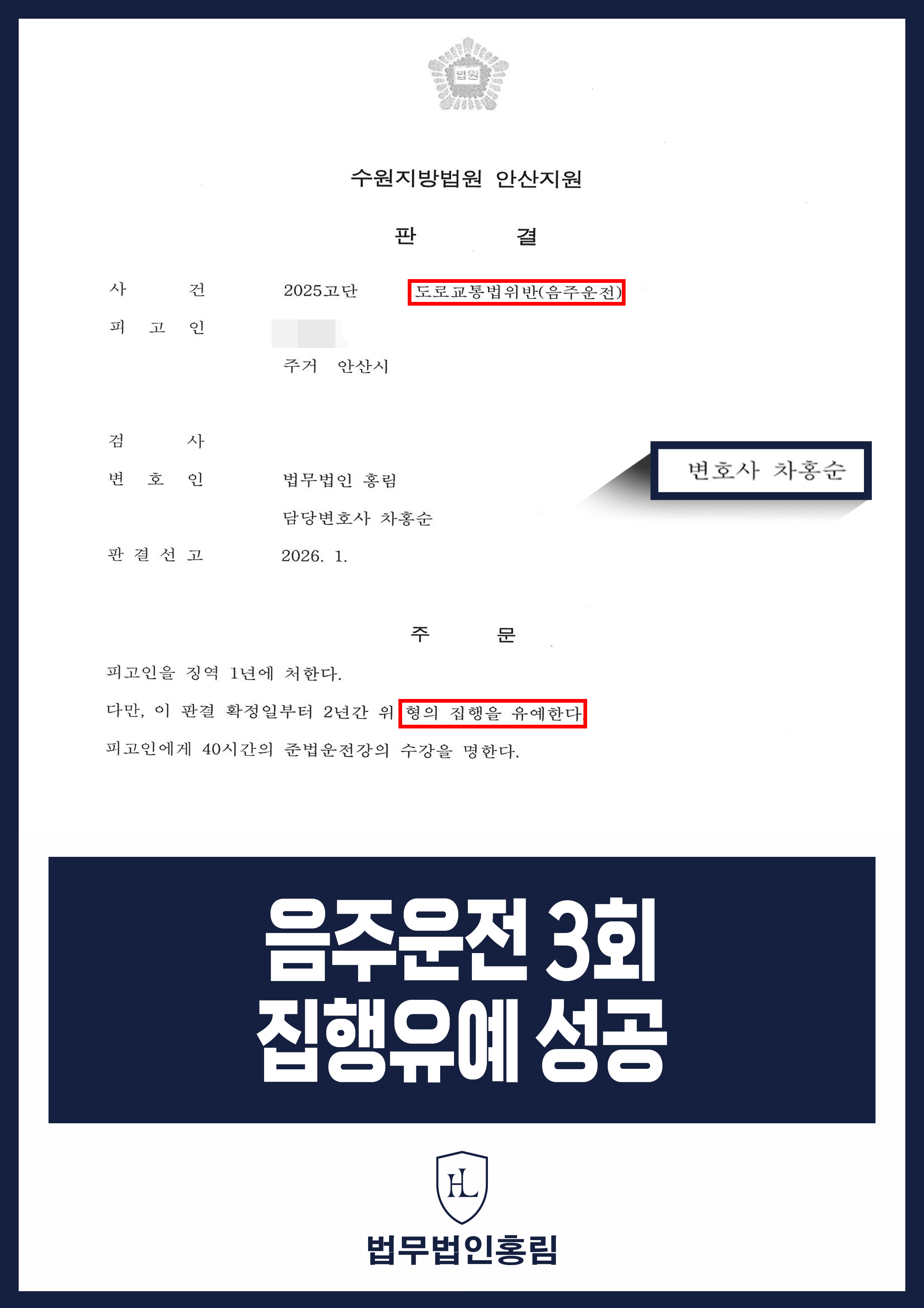 음주운전 3회 집행유예 성공 - 10년 내 음주운전 3회 했지만 변호인 조력으로 집행유예 성공 2026.01.15