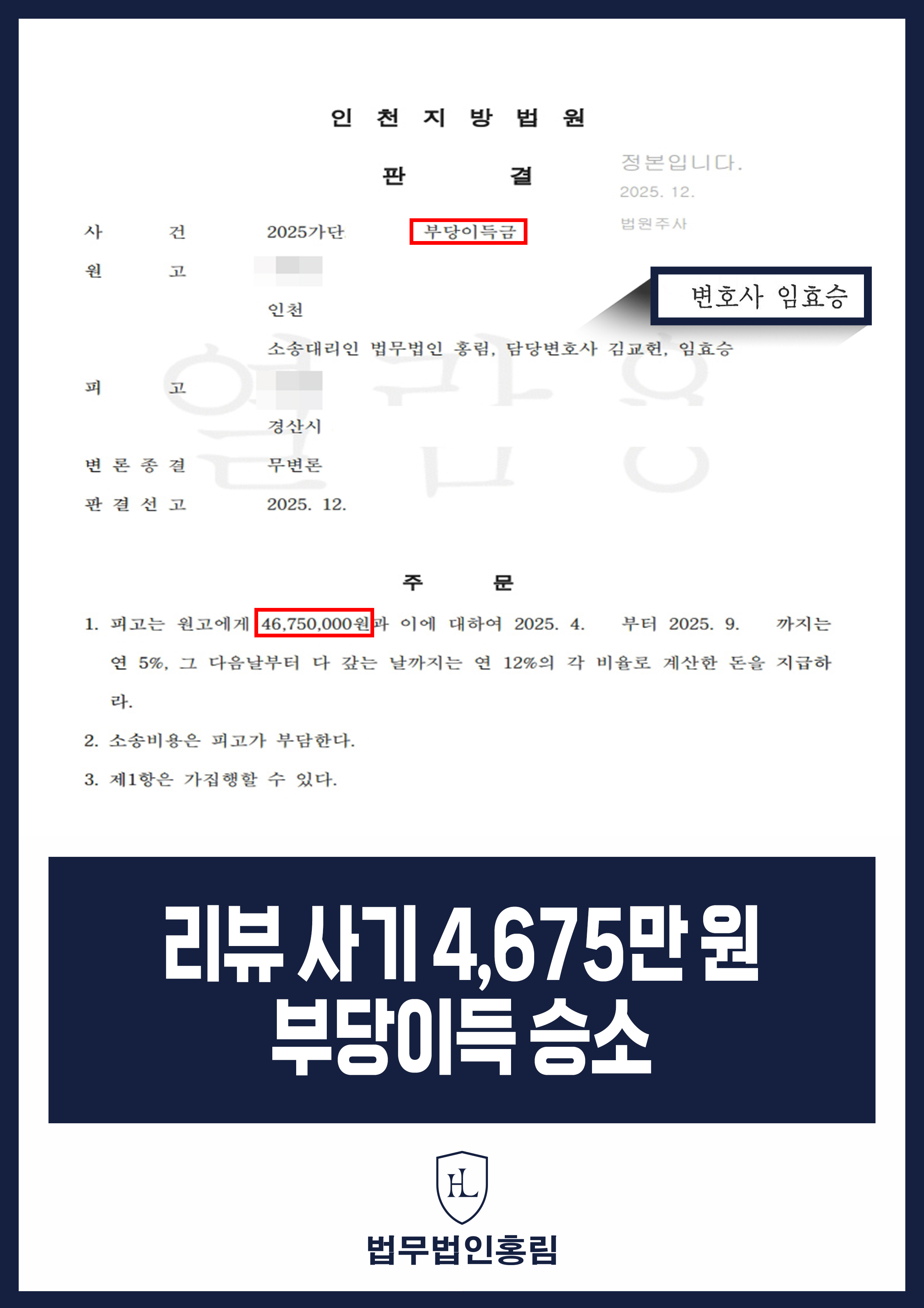 리뷰 사기 4,675만 원 부당이득 승소 - 인터넷 쇼핑몰 리뷰 알바 빙자 사기 피해 당해 부당이득금 소송 승소 2025.12.11