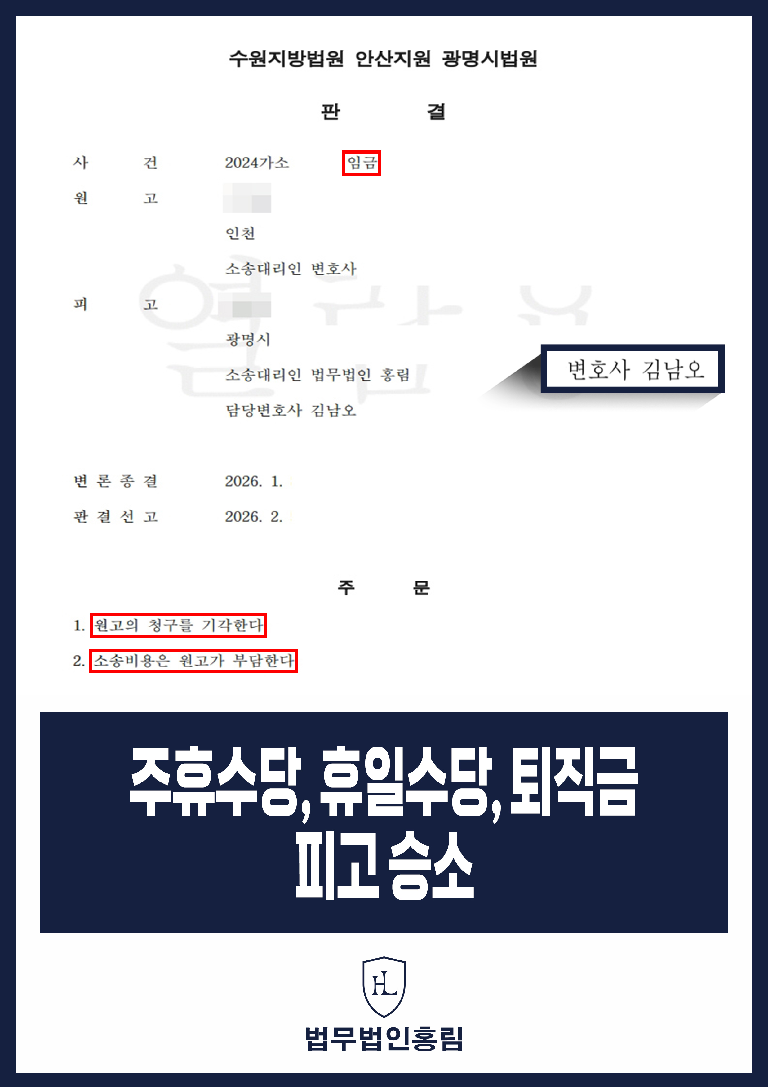 주휴수당, 휴일수당, 퇴직금 피고 승소 - 퇴사한 직원의 부당한 퇴직금 요구 기각 완전 승소 2026.02.06