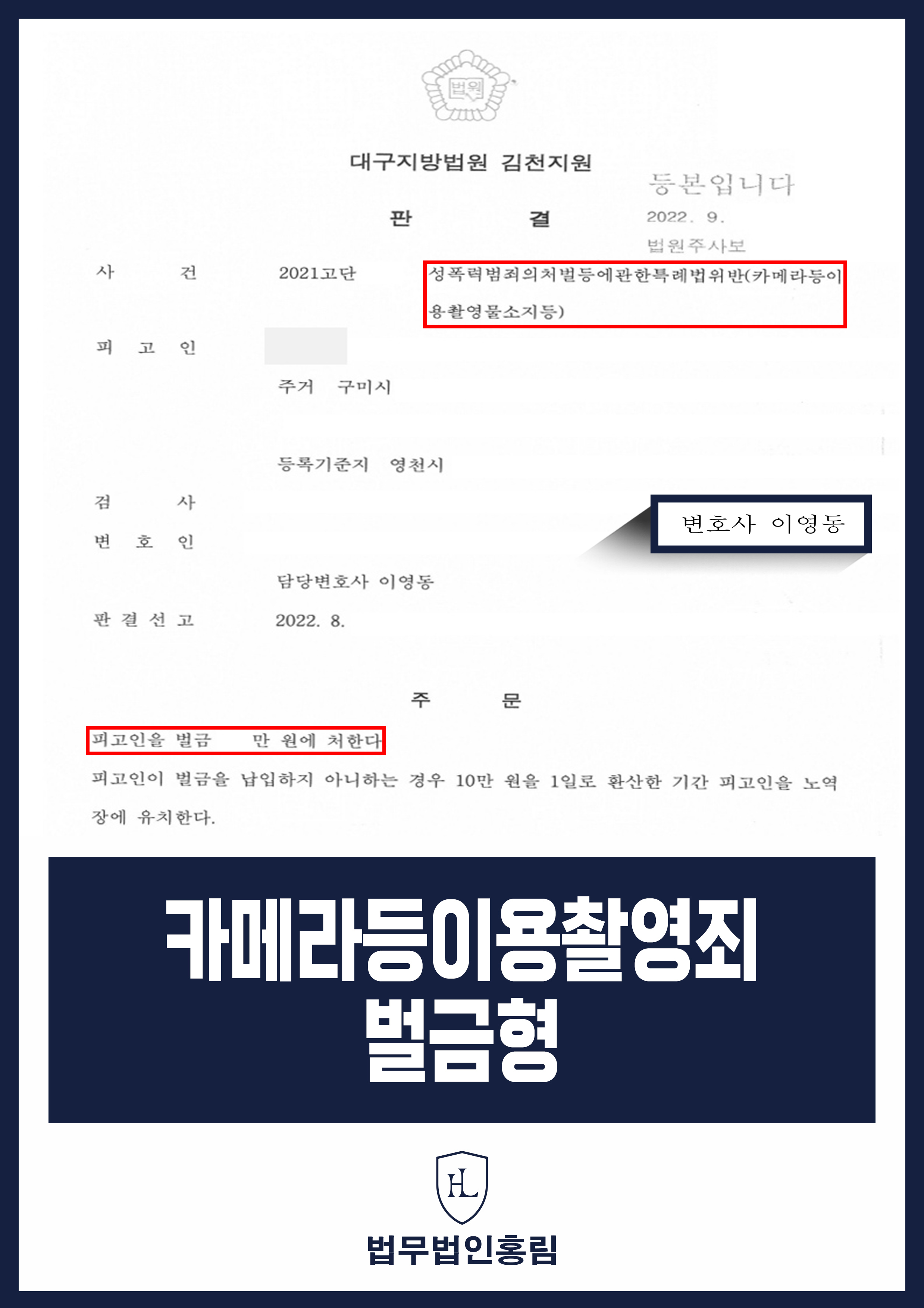 카메라등이용촬영죄는 처벌 수위가 높 범죄 유형으로, B씨는 실형 선고와 신상정보 등록이라는 최악의 결과를 두려워하며 법무법인 홍림의 문을 두드리셨습니다.