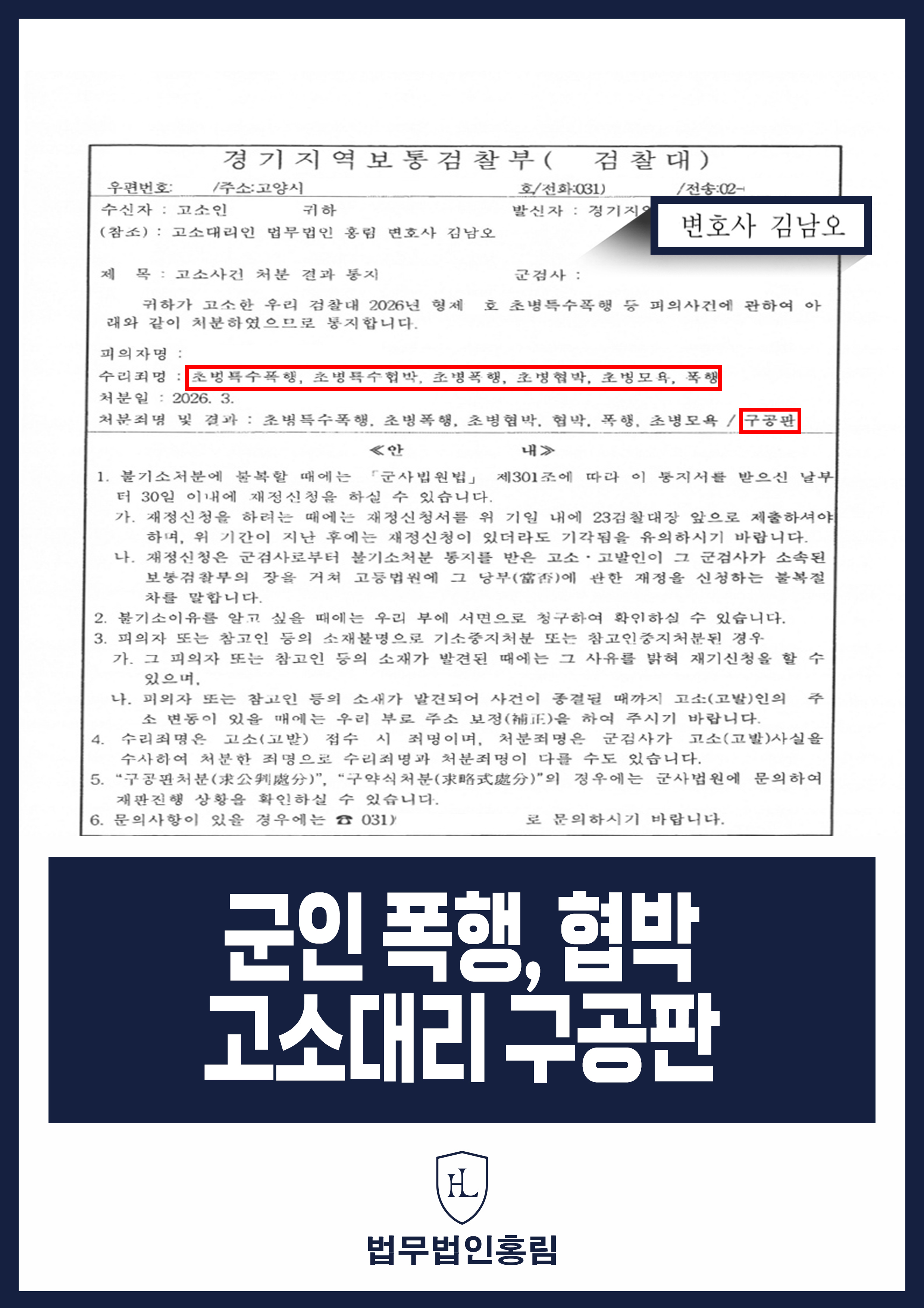 법무법인 홍림의 치밀한 증거 제시와 전략적인 고소대리 결과, 군 검찰은 가해자의 혐의를 무겁게 받아들였습니다. 검찰은 가해자의 초병특수폭행, 초병폭행, 초병협박, 협박, 폭행, 초병모욕 등 모든 혐의를 인정하여 사건을 '구공판(정식 재판 회부)' 처분했습니다.