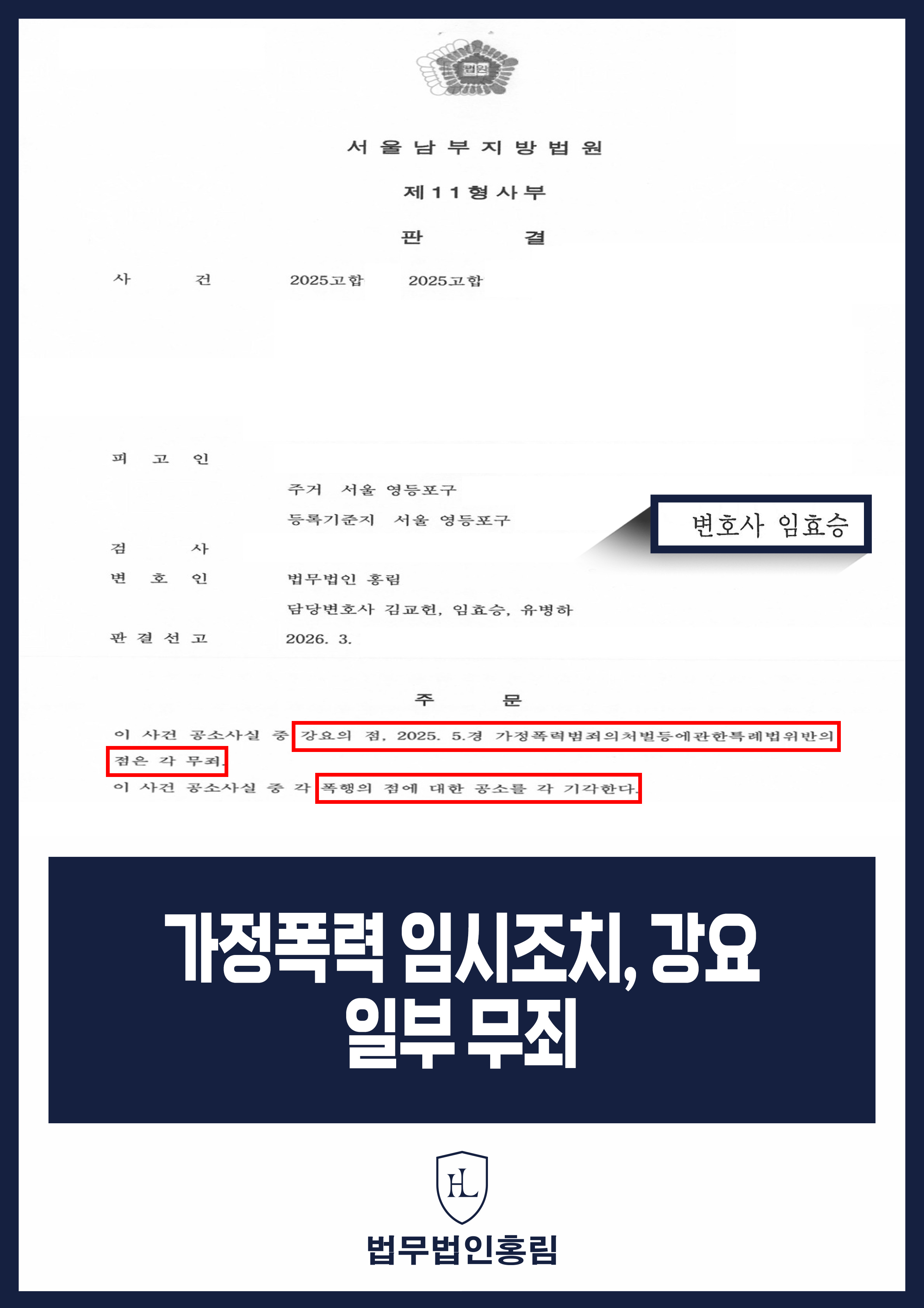 가정폭력 임시조치, 강요 일부 무죄 - 이혼 분쟁 중 제기된 범죄 혐의 일부 무죄 성공 2026.04.03